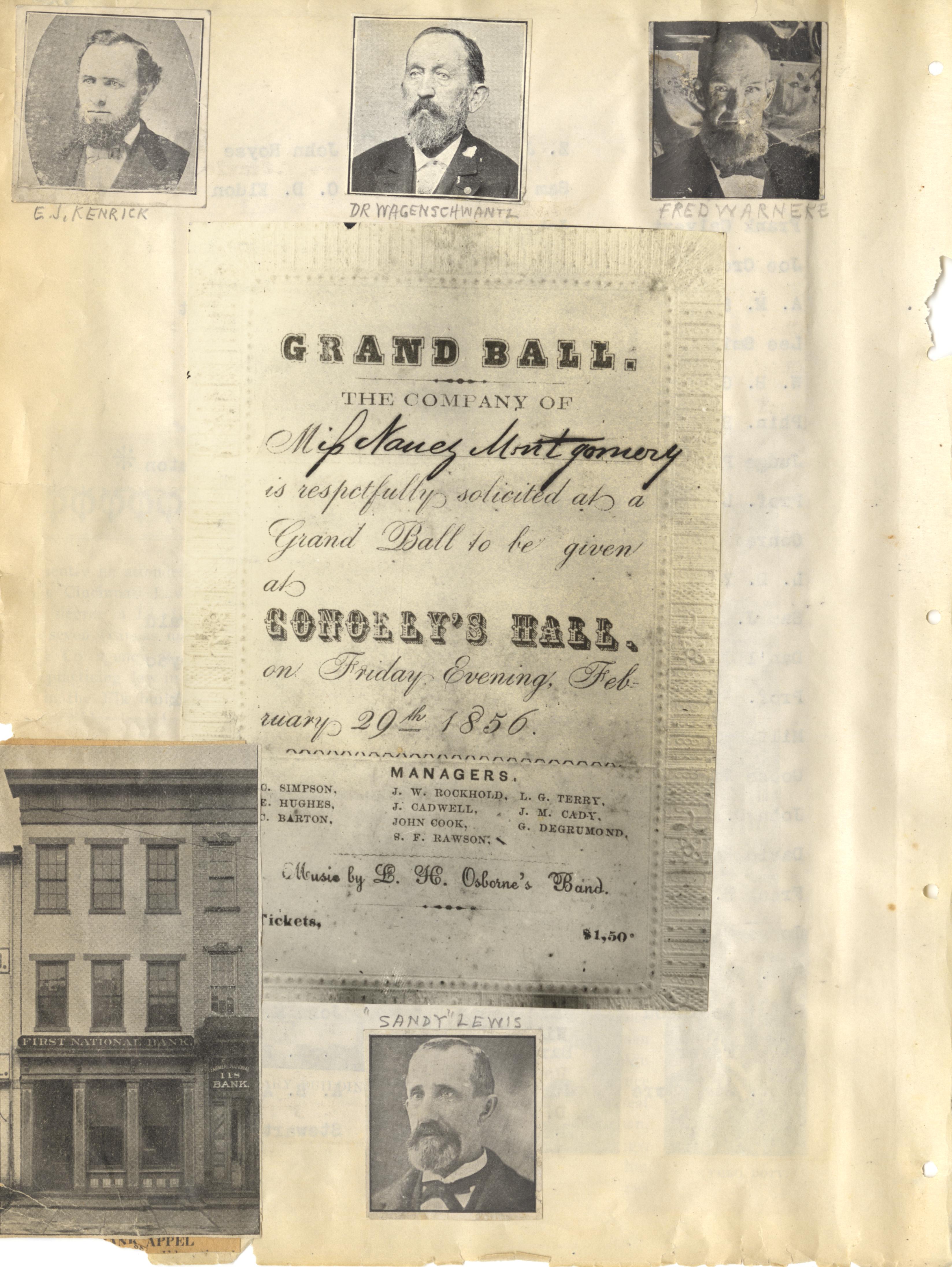- Photo image of scanned scrapbook page. Pictured is E. J. Kenrick; Dr. Wagenschwantz; Sandy Lewis; Fred Warneke; Invitation to the Grand Ball; First National Bank