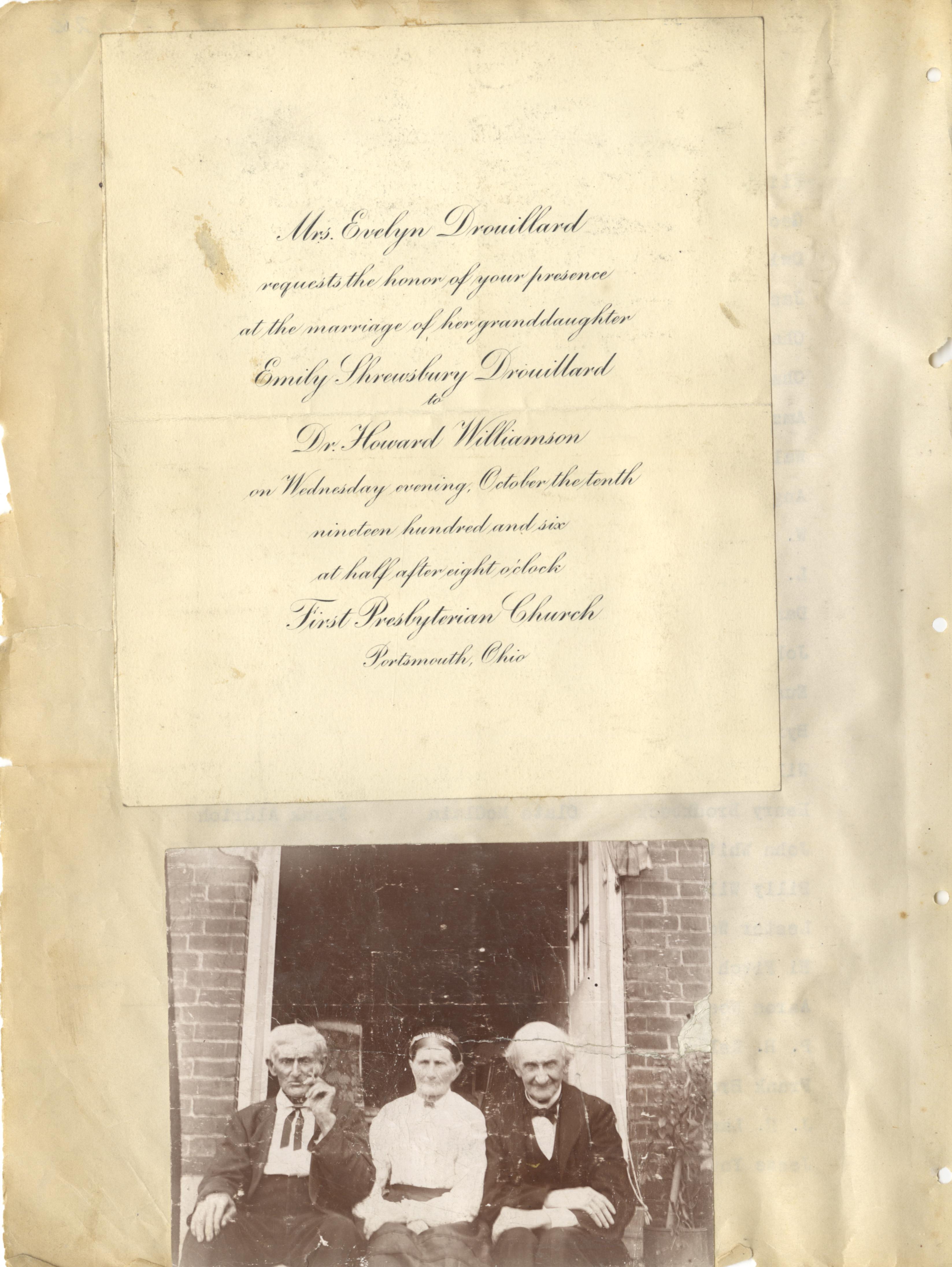 - Photo image of scanned scrapbook page. Pictured is a Wedding Invitation for Emily Shrewsbury Drouillard to Dr. Howard Williams; Unknown Elderly Individuals