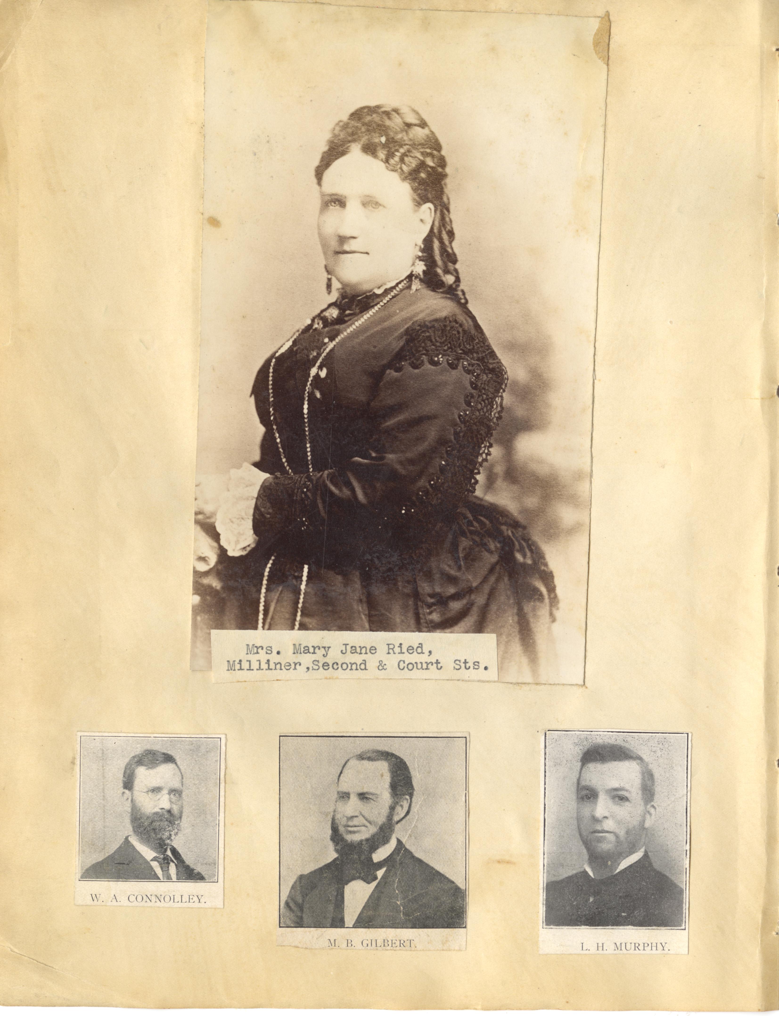 - Photo image of scanned scrapbook page. Pictured: Mrs. Mary Jane Reid, Milliner at Second (2nd) and Court Streets. A milliner was someone who made or sold women's hats. Also shown is W. A. Connolley; M. B. Gilbert; L. H. Murphy