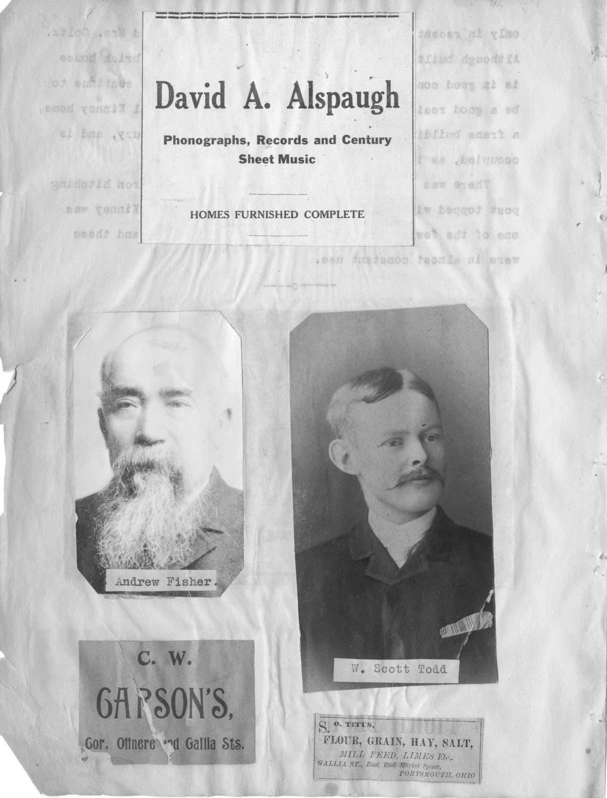 - Scanned unnumbered page from Henry A. Lorberg scrapbook containing black & white images of Andrew Fisher and W. Scott Todd. Clippings of advertisements for David A. Alspaugh; C. W. Gapson's; and S. O. Titus, Flour, Grain, Hay, Salt.