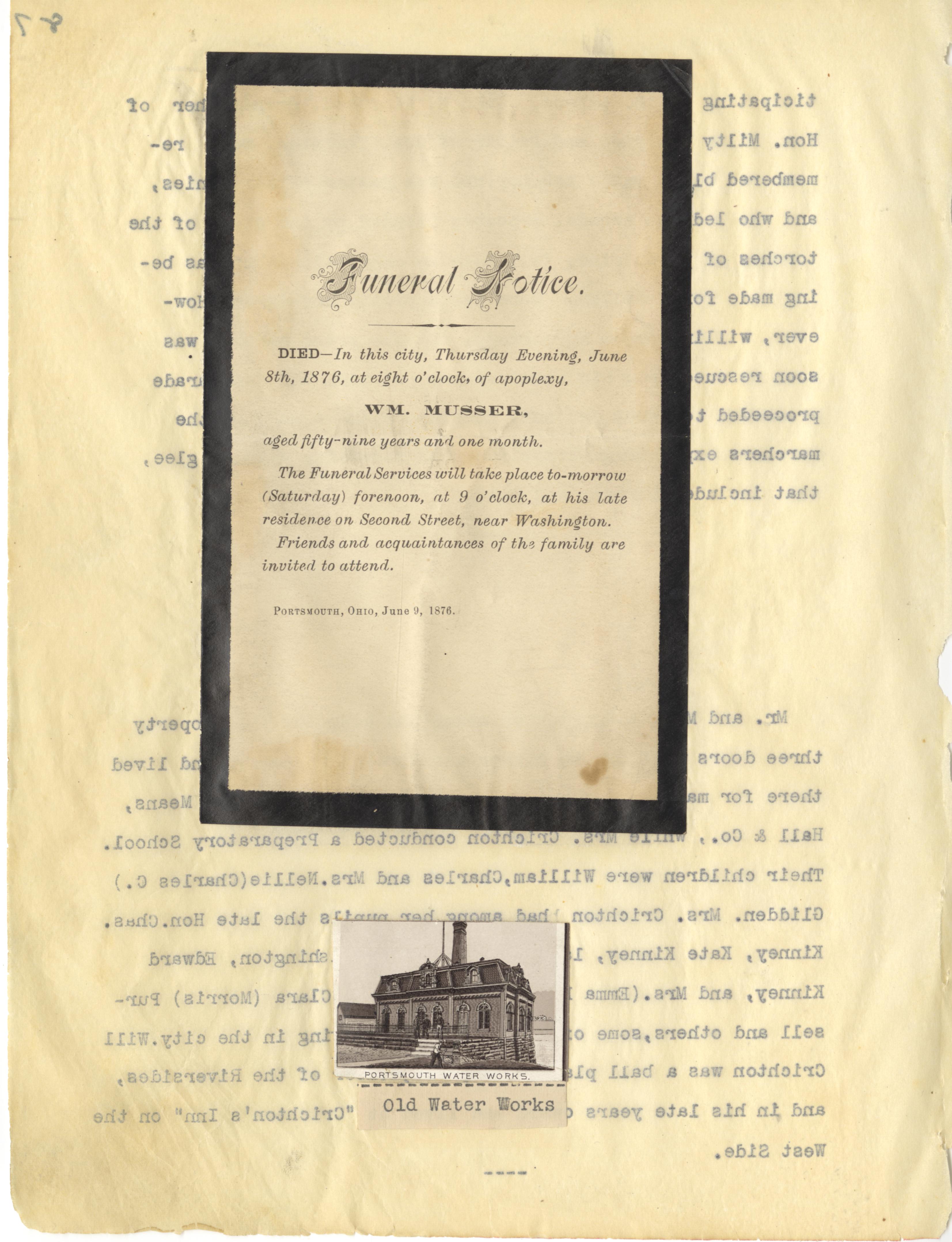 - Photo image of scanned scrapbook page. Pictured: Funeral Notice for William Musser (June 9, 1876); Old Water Works