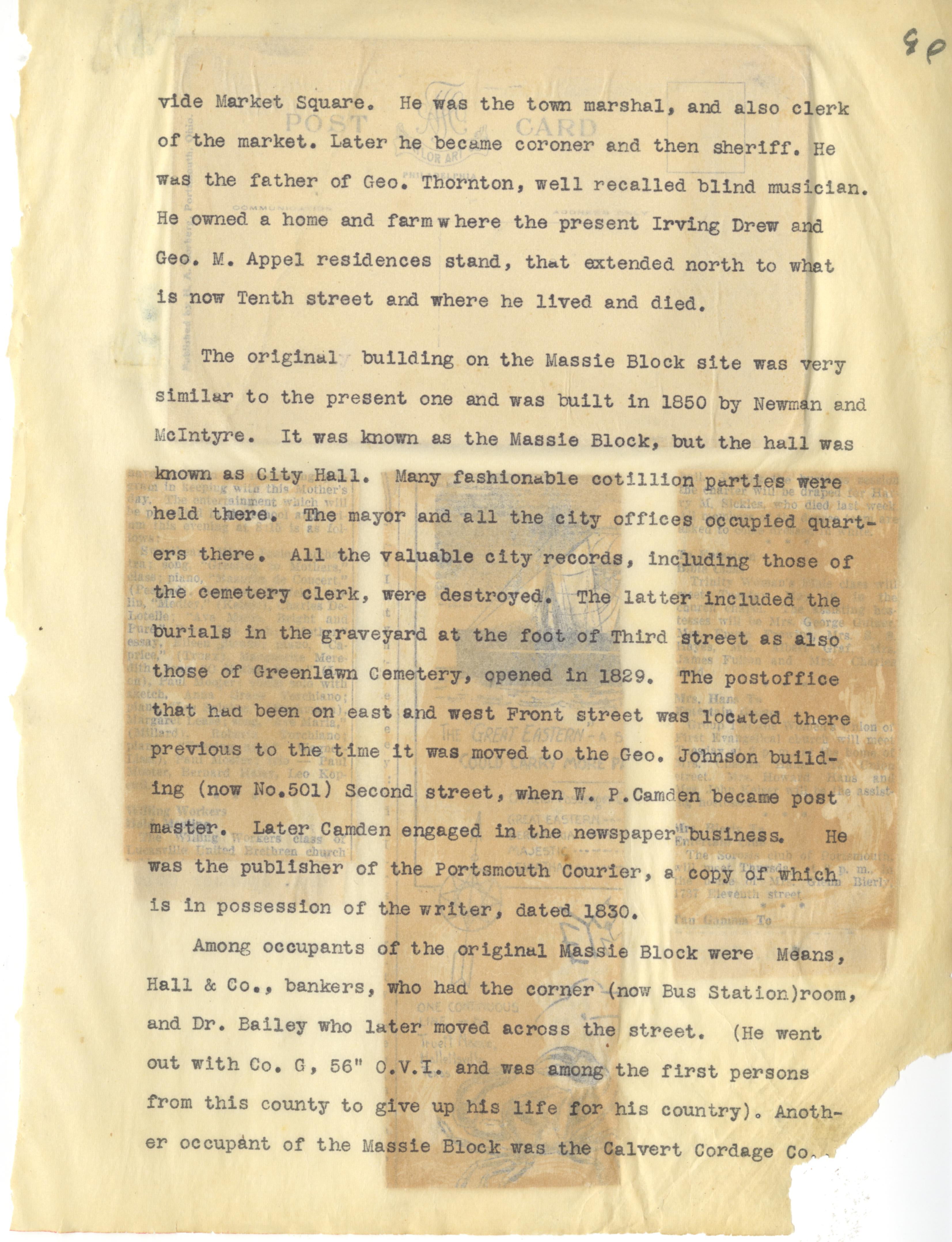 - Photo image of scanned scrapbook page. Pictured: typed page talking about Massie Block and its history; town bull; John Thornton; Greenlawn Cemetery; Johnson Building; Geo. Johnson; W. P. Camden; Means, Hall & Co.; Dr. Bailey; Calvert Cordage Co.
