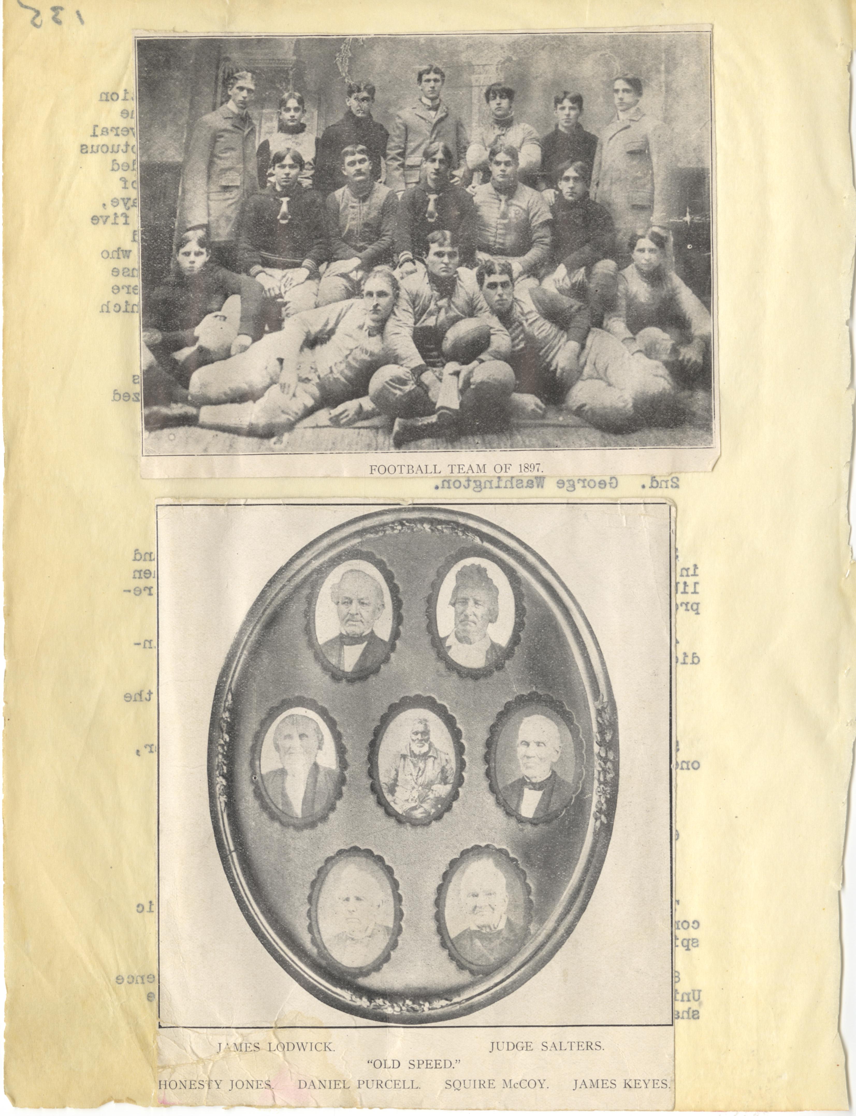 - Photo image of scanned scrapbook page. Pictured: Football Team of 1897; Prominent Portsmouth Citizens with names listed below: James Lodwick, Honesty Jones, Daniel Purcell, "Old Speed," Judge Salters, Squire McCoy, James Keyes