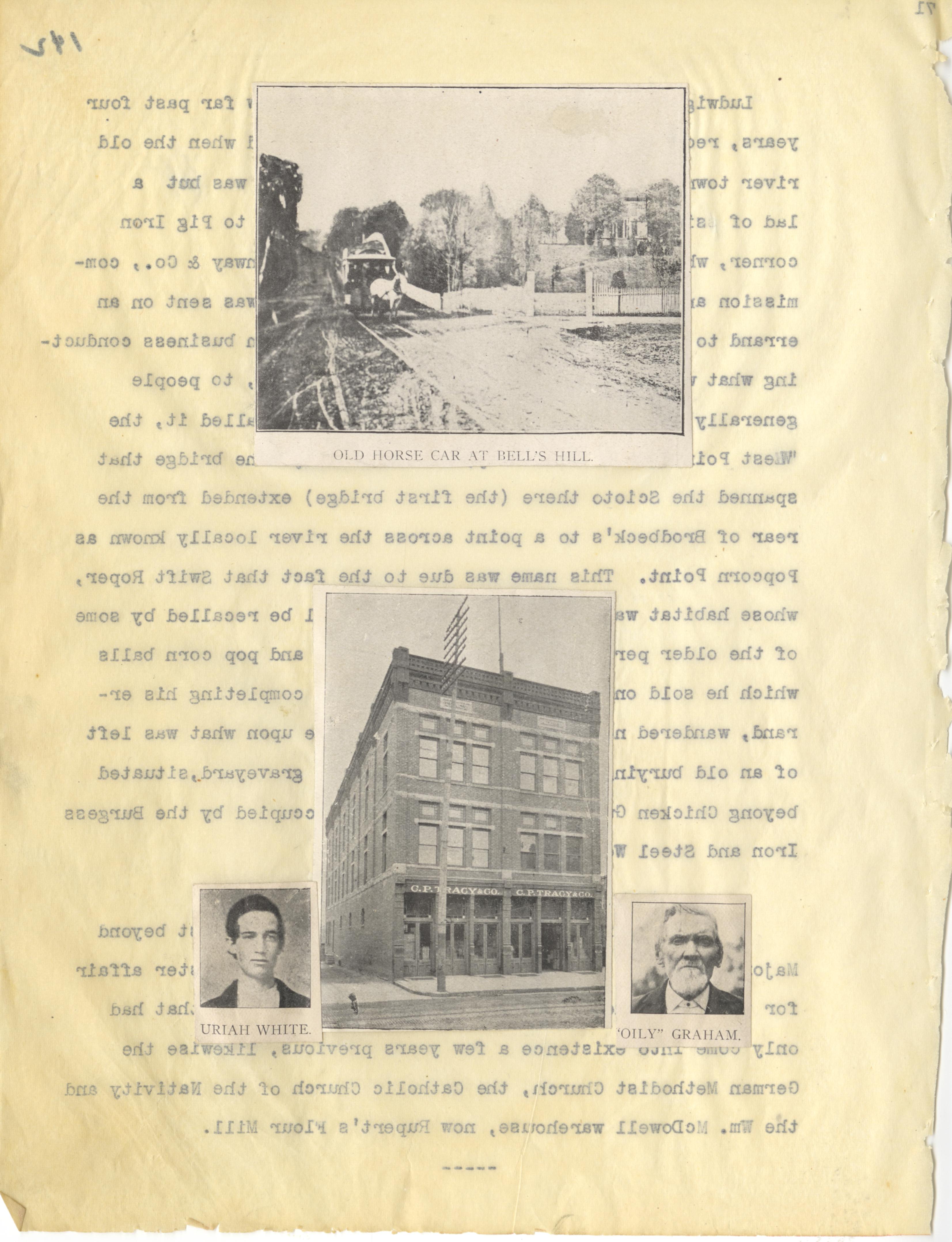 - Photo image of scanned scrapbook page. Pictured: Old Horse Car at Bell's Hill; Uriah White; "Oily" Graham; C. P. Tracy & Co.