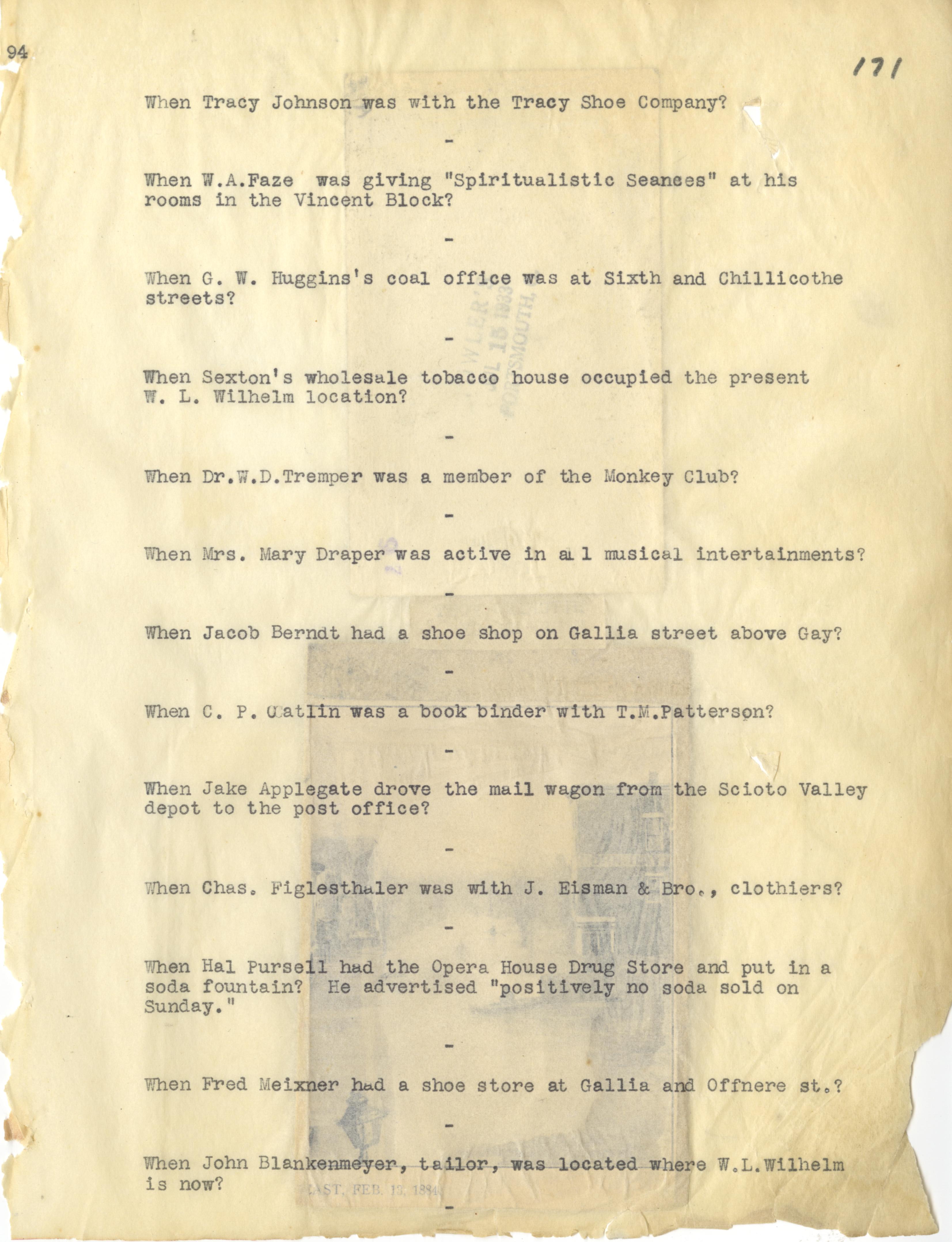 - Photo image of scanned scrapbook page. Pictured: typed page from Do You Remember Continued. Tracy Johnson was with the Tracy Shoe Company; W. A. Fraze was giving spiritualistic seances at his rooms in the Vincent Block; G. W. Huggins coal Office; Sexton's wholesale tobacco house occupied the present W. L. Wilhelm location; Dr. W. D. Tremper, member of the Monkey Club; Mary Draper; Jacob Berndt; C. P. Gatlin, book binder with T. M. Patterson; Jake Applegate drove mail wagon; Chas. Figlesthaler was with J. Eisman & Bros. Clothiers; Hal Pursell had Opera House Drug Store and put in a soda fountain; Fred Meixner; John Blankenmeyer, located where W. L. Wilhem's is now