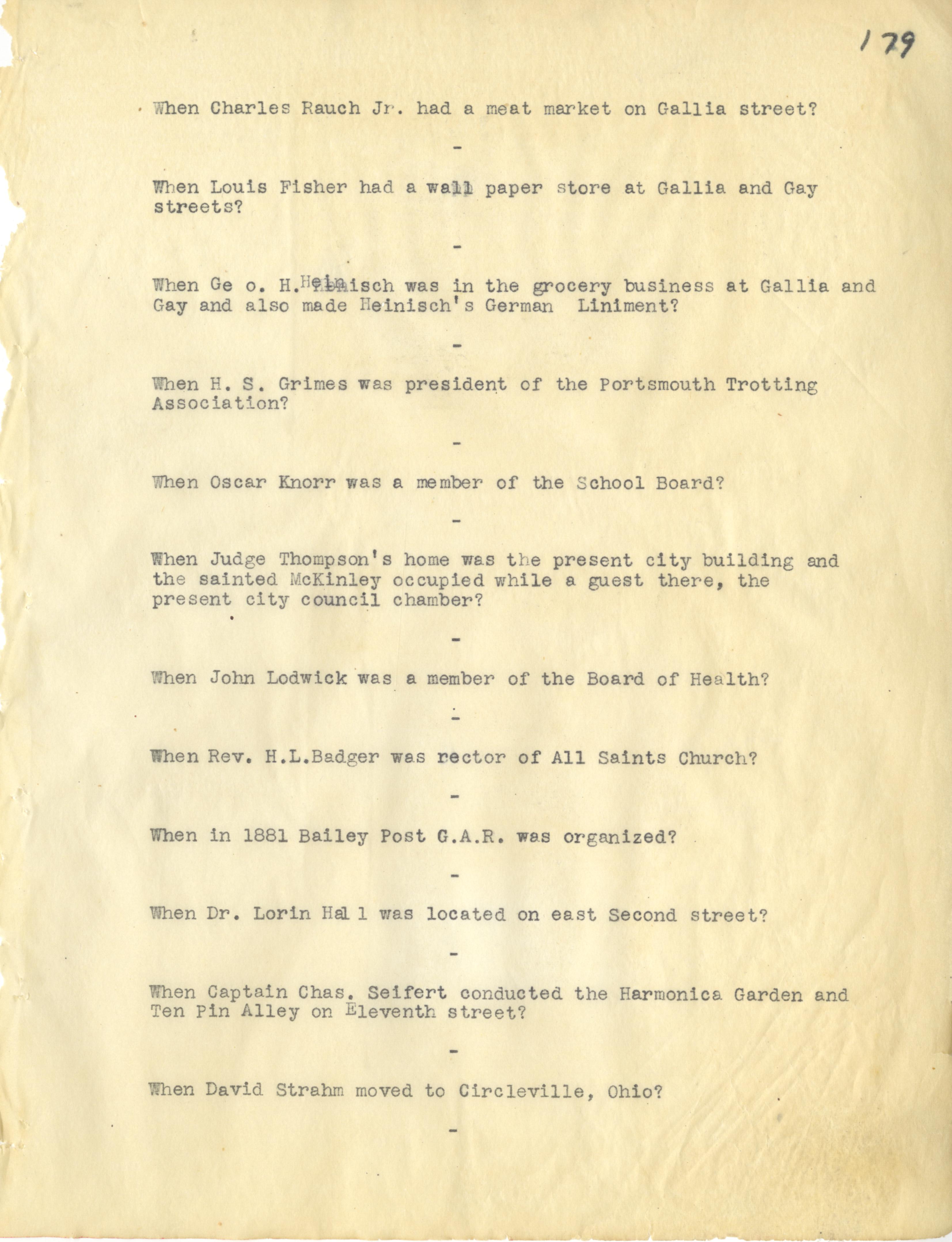 - Photo image of scanned scrapbook page 179. Pictured: typed page from Do You Remember Continued. Charles Rauch Jr.; Louis Fisher; George Heinisch; H. S. Grimes, president of the Portsmouth Trotting Association; Oscar Knorr was a member of the School Board; Judge Thompson; John Lodwick, member of the Board of Health; Rev. H. L. Badger, rector of All Saints' Church; Bailey Post G. A. R. was organized in 1881; Dr. Lorin Hall; Captain Charles Seifert and the Harmonica Garden and Ten Pin Alley; David Strahm