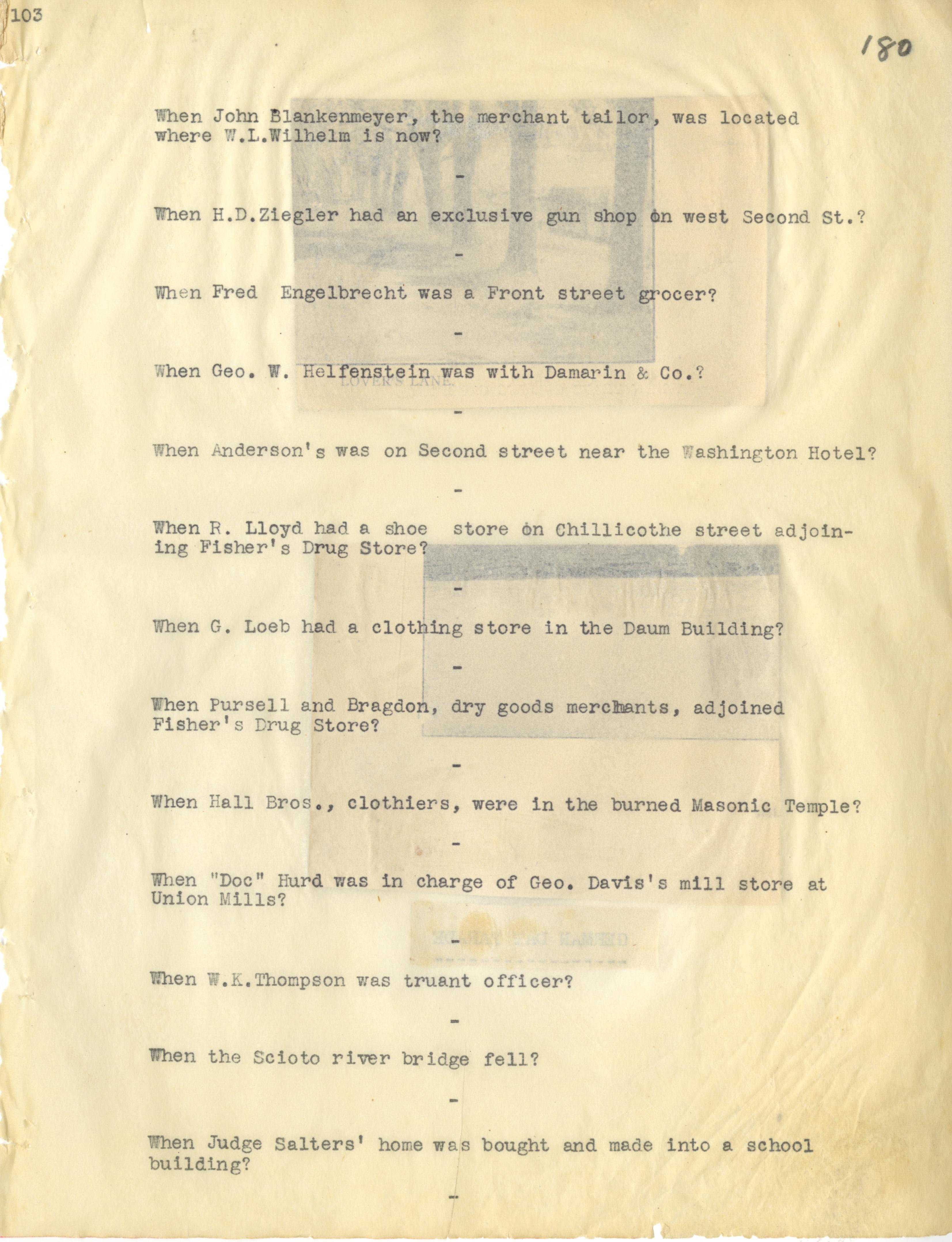 - Photo image of scanned scrapbook page 180. Pictured: typed page from Do You Remember Continued. John Blankenmeyer, located where Wilhelm's is now; H. D. Ziegler; Fred Engelbrecht; George W. Helfenstein was with Damarin & Co.; Anderson's; Washington Hotel; R. Lloyd; Fisher's Drug Store; G. Loeb's clothing store in the Daum building; Pursell and Bragdon's; Hall Bros. burned in Masonic Temple; "Doc" Hurd in charge of George Davis' mill store at Union Mills; W. K. Thompson; Judge Salter