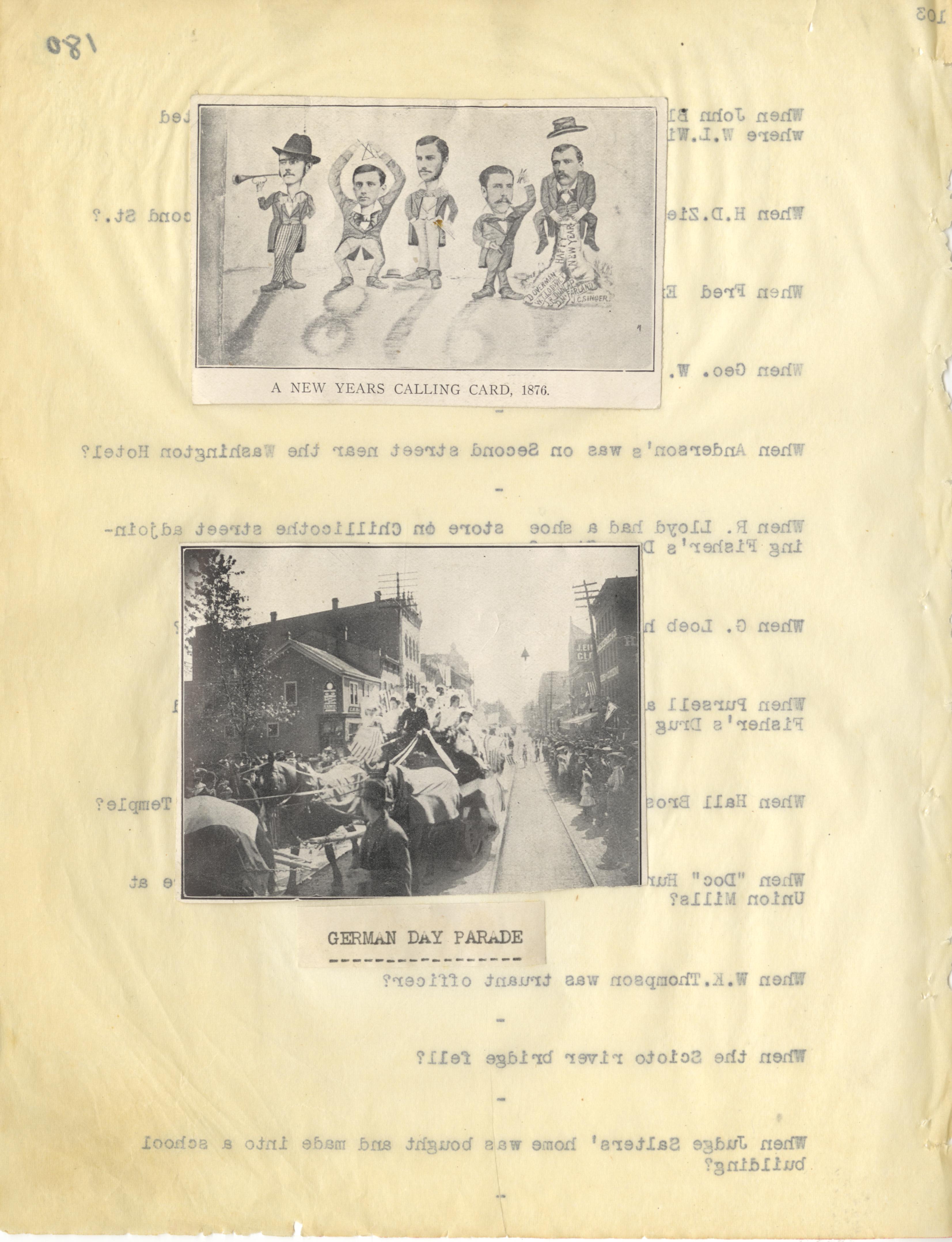 - Photo image of scanned scrapbook page. Pictured: A New Years Calling Card (1876); German Day Parade