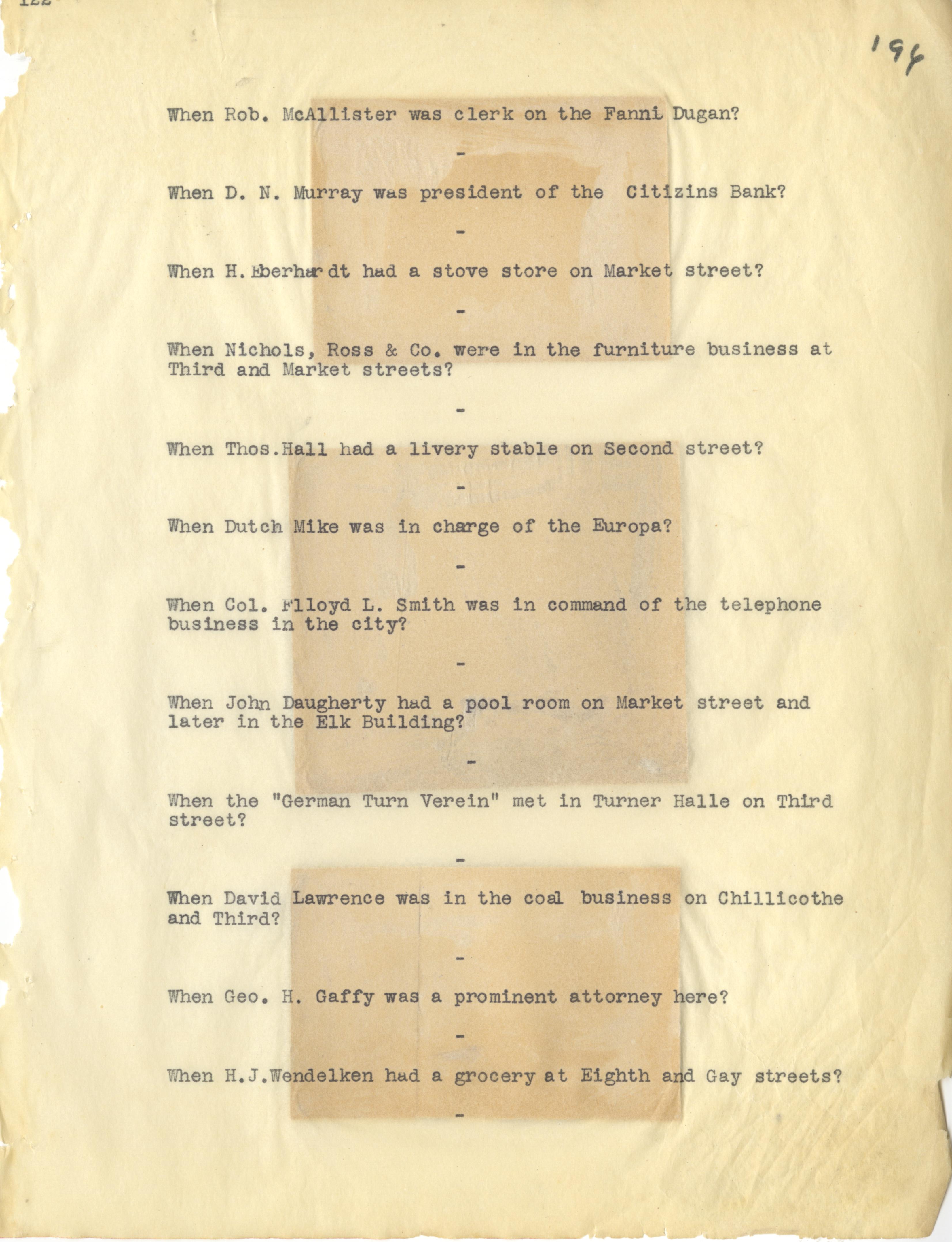 - Photo image of scanned scrapbook page 196. Pictured: typed page from Do You Remember Continued. Rob McAllister, clerk on the Fannie Dugan; D. N. Murray, president of Citizens Bank; H. Eberhardt; Nicholas, Ross & Co.; Thomas Hall; Dutch Mike; Europa Hotel; Col. Floyd L. Smith; John Daugherty; Elk Building; "German Turn Verein" met in Turner Hall; David Lawrence; George H. Gaffy; H. J. Wendelken