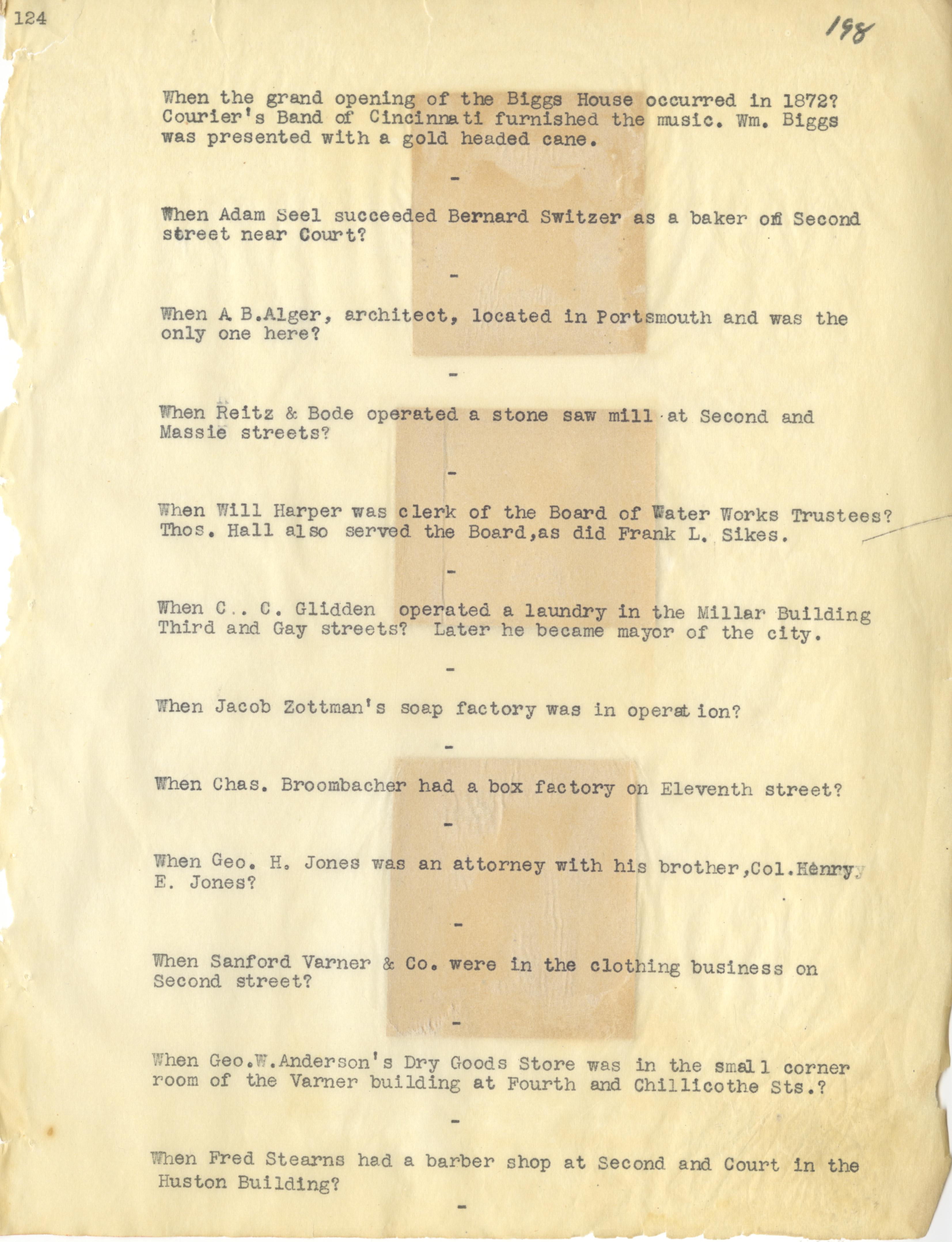 - Photo image of scanned scrapbook page 198. Pictured: typed page from Do You Remember Continued. Grand opening of the Biggs House in 1872; Adam Seel; Bernard Switzer; A. B. Alger; Reitz & Bode; Will Harper; Board of Water Works Trustees;Thomas Hall; Frank L. Sikes; C. C. Glidden; Millar Building; Jacob Zottman's soap factory; Charles Broombacher; George H. Jones; Col. Henry E. Jones; Sanford Varner & Co.; George W. Anderson's Dry Goods Store; Fred Stearns; Huston Building