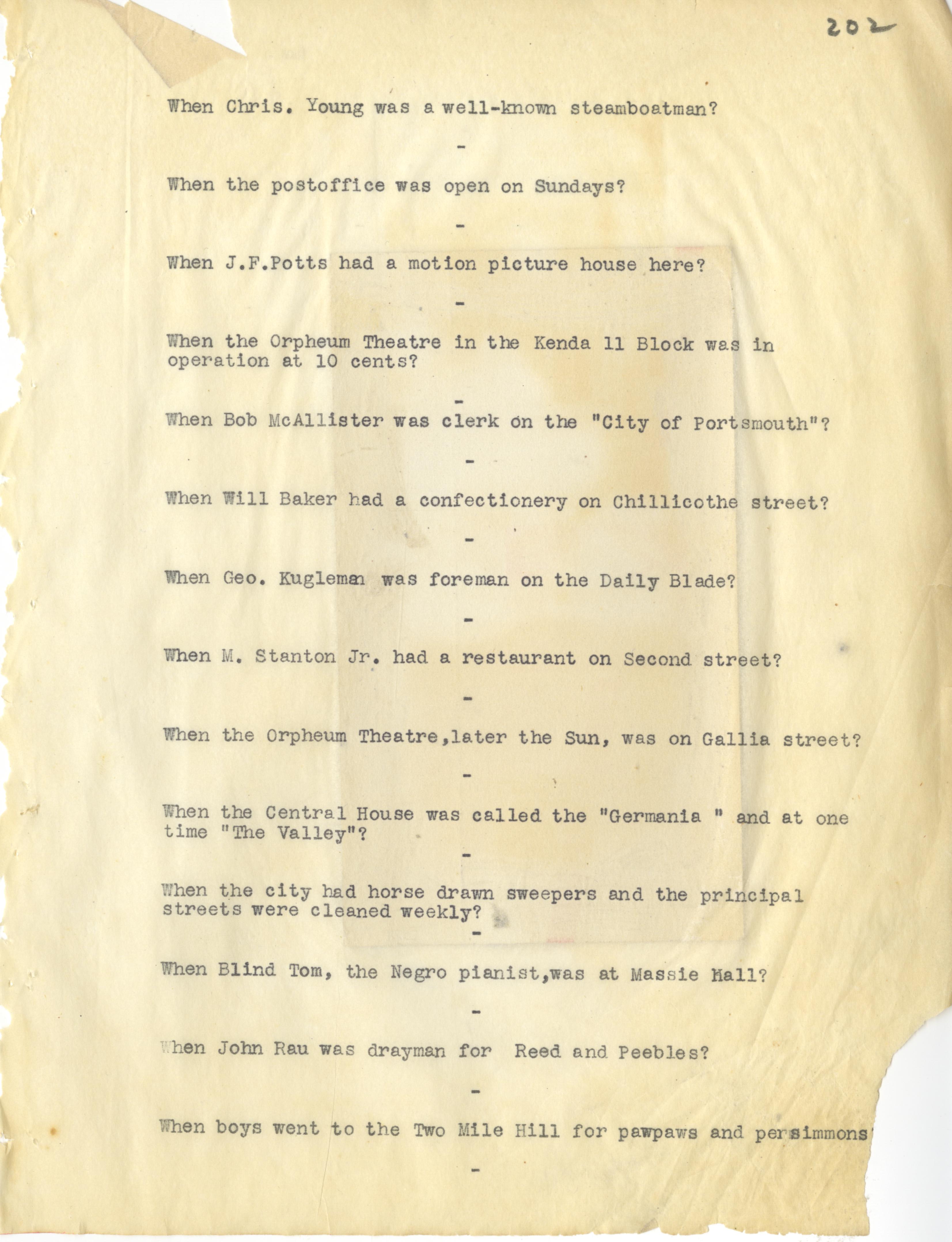 - Photo image of scanned scrapbook page 202. Pictured: typed page from Do You Remember Continued. Chris Young; post office; J. F. Potts; Orpheum Theatre in Kendall Block; Bob McAllister, clerk on the City of Portsmouth; Will Baker; George Kugleman; Daily Blade; M. Stanton Jr.; Orpheum Theatre; Sun Theatre;Central House; Germania; The Valley; Blind Tom, pianist at Massie Hall; John Rau; Reed and Peebles; Two Mile Hill
