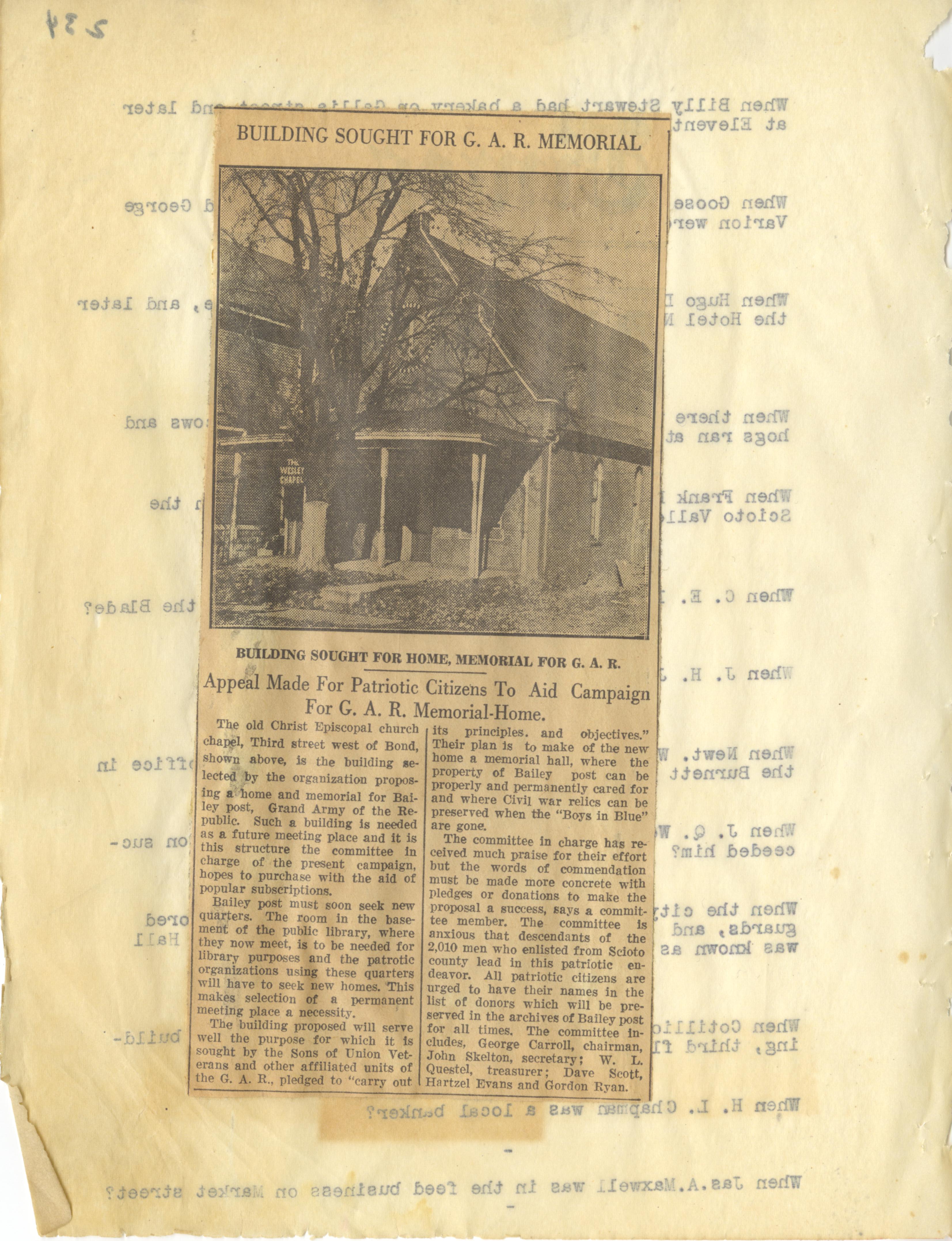 - Photo image of scanned scrapbook page. Pictured: newspaper article entitled "Building Sought for G. A. R. Memorial."