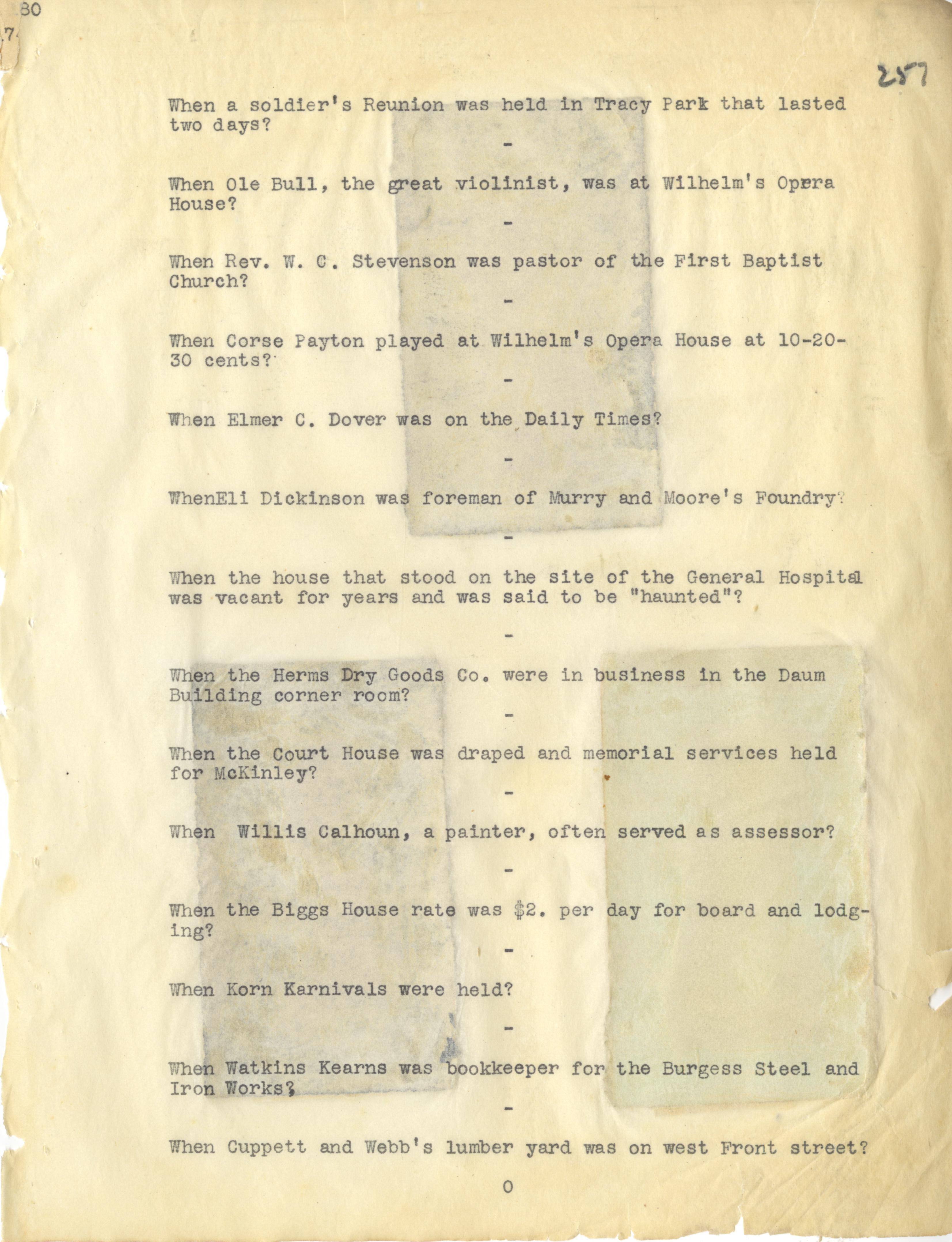 - Photo image of scanned scrapbook page. Pictured: typed page from Do You Remember Continued. Soldier's Reunion in Tracy Park; Ole Bull; Wilhelm's Opera House; Rev. W. C. Stevenson; First Baptist Church; corse Payton; Elmer C. Dover; Eli Dickinson; Murry and Moore's Foundry; General hospital; Herms Dry Goods Co.; Daum Building corner; Court House was draped in memorial services for McKinley; Willis Calhoun; Biggs House; Korn Karnival; Watkins Kearns; Burgess Steel and Iron Works; Cuppett and Webb's lumber yard on Front Street