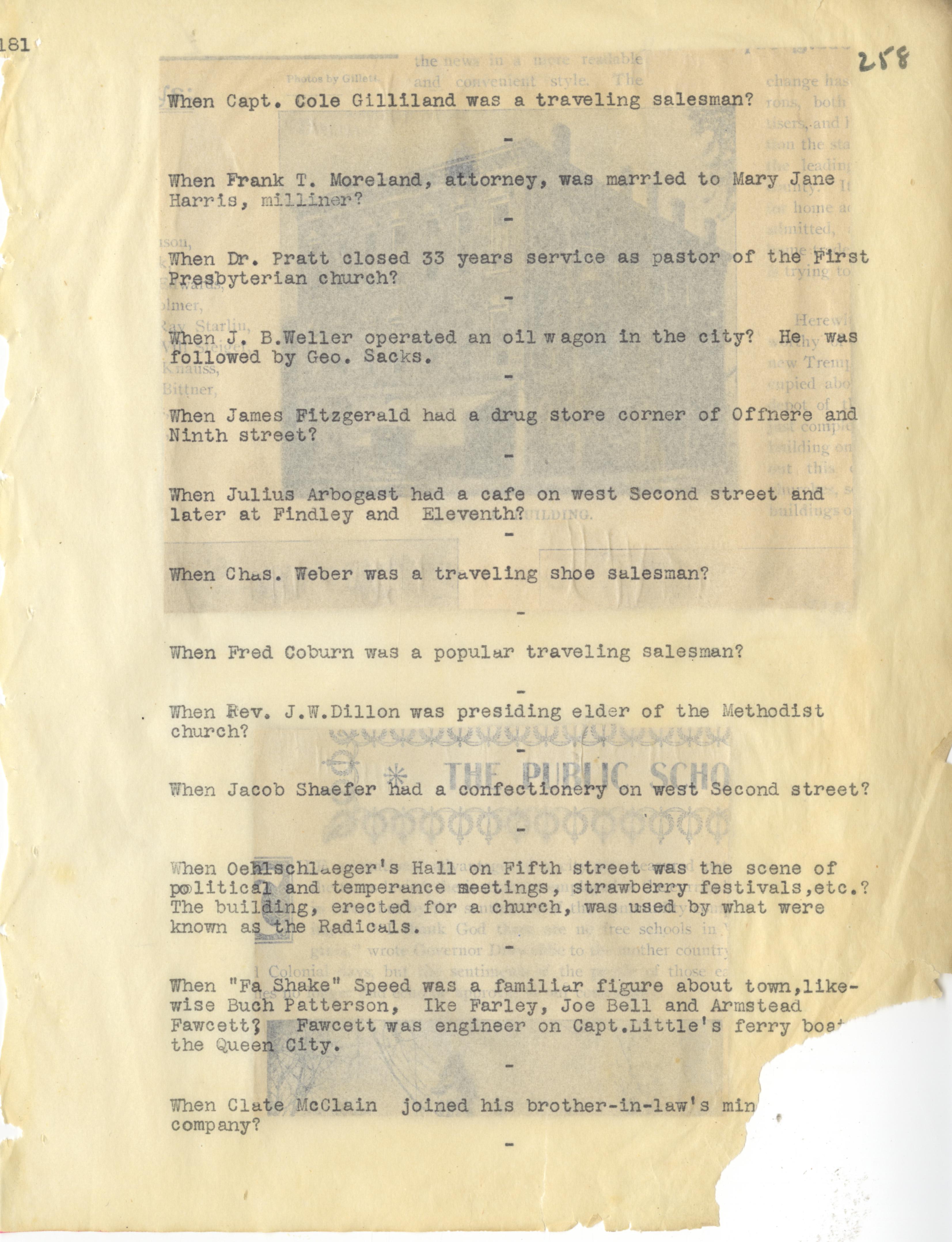 - Photo image of scanned scrapbook page. Pictured: typed page from Do you Remember Continued. Capt. Cole Gilliland; Frank T. Moreland; Mary Jane Harris; Dr. Pratt; First Presbyterian Church; James Fitzgerald; Julius Arborgast; Charles Weber; Fred Coburn; Rev. J. W. Dillon; Jacob Shaefer; Oehlschlaeger's Hall; Butch Patterson; Ike Farley; Joe Bell; Armstead Fawcett; Queen City; Clate McClain