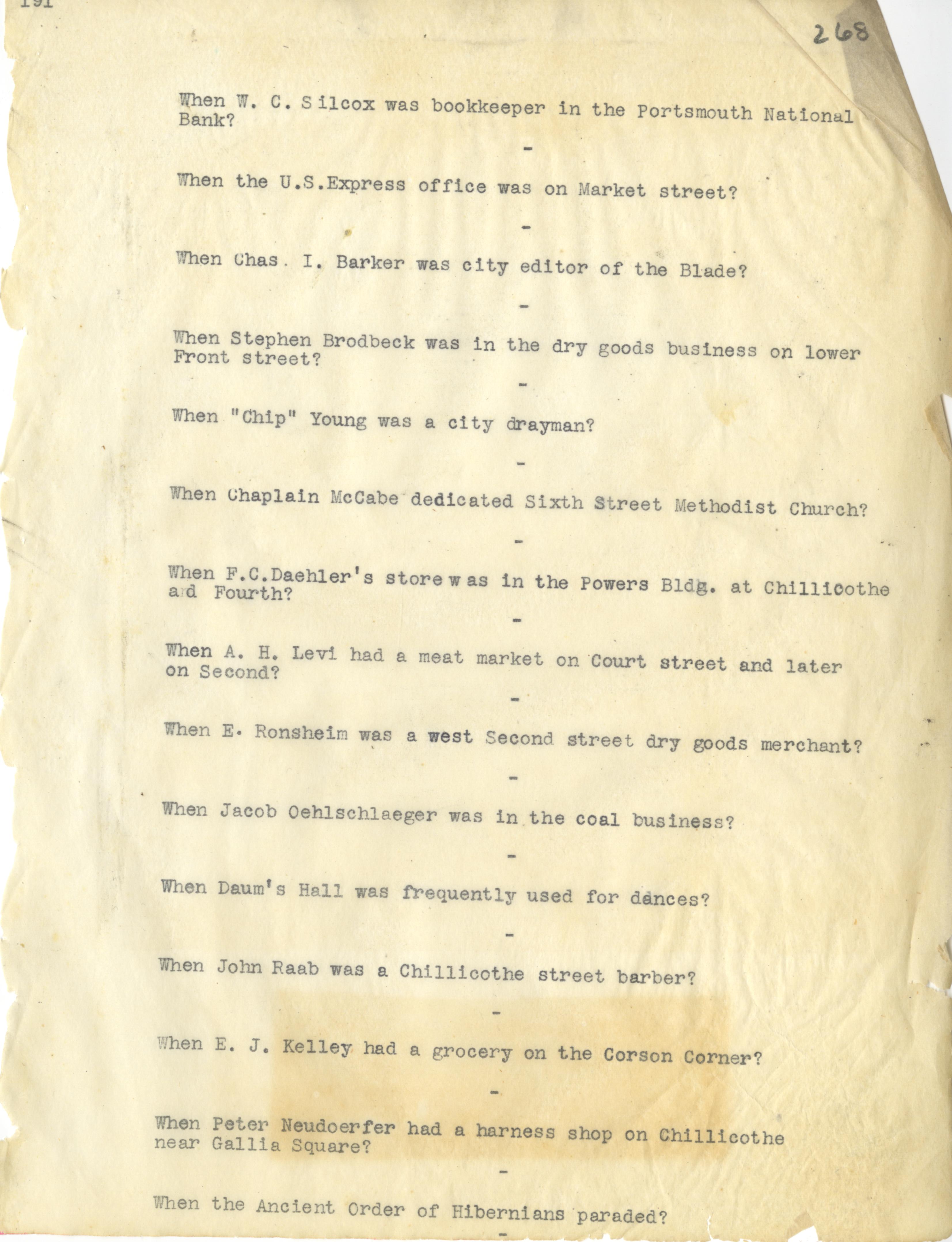 - Photo image of scanned scrapbook page. Pictured: typed page from Do You Remember Continued. W. C. Silcox; Portsmouth National Bank; U. S. Express office was on Market Street; Charles I. Barker; the Portsmouth Blade; Stephen Brodbeck; "Chip" Young; Chaplain McCabe; F. C. Daehler's store in the Powers Building; A. H. Levi; E. Ronsheim; Jacob Oehlschlaeger; Daum's Hall; John Raab; E. J. Kelley; Peter Neudoerfer; Gallia Square; Ancient Order of Hibernians