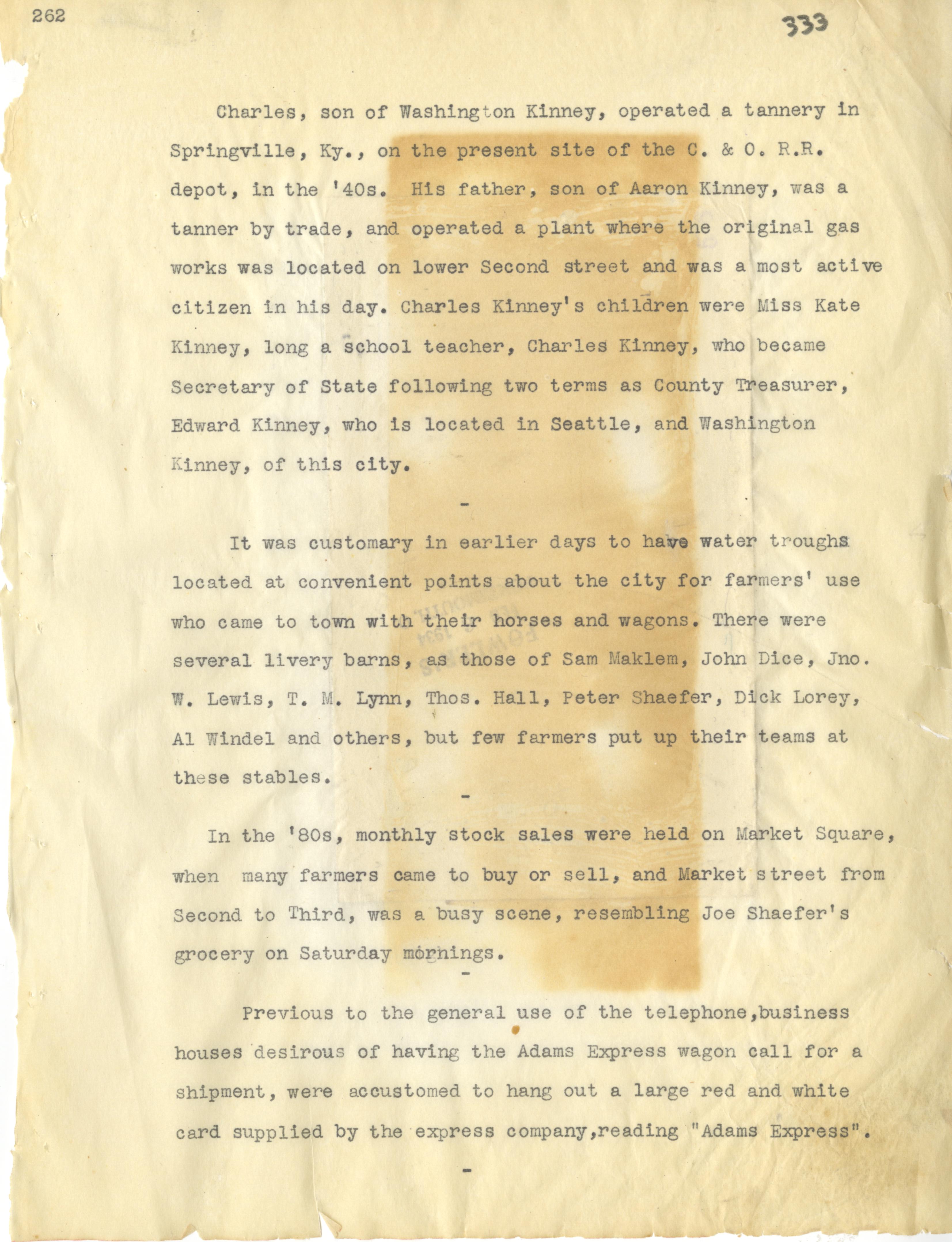 - Photo image of scanned scrapbook page 333. Pictured: Charles; Washington Kinney; C. & O. R.R. Depot (1840s); Aaron Kinney; Miss Kate Kinney; Edward Kinney; Water Troughs; Sam Maklem; John Dice; Dick Lorey; Al Windel; Market Square (1880s); Joe Shaefer; Telephone; Adams Express