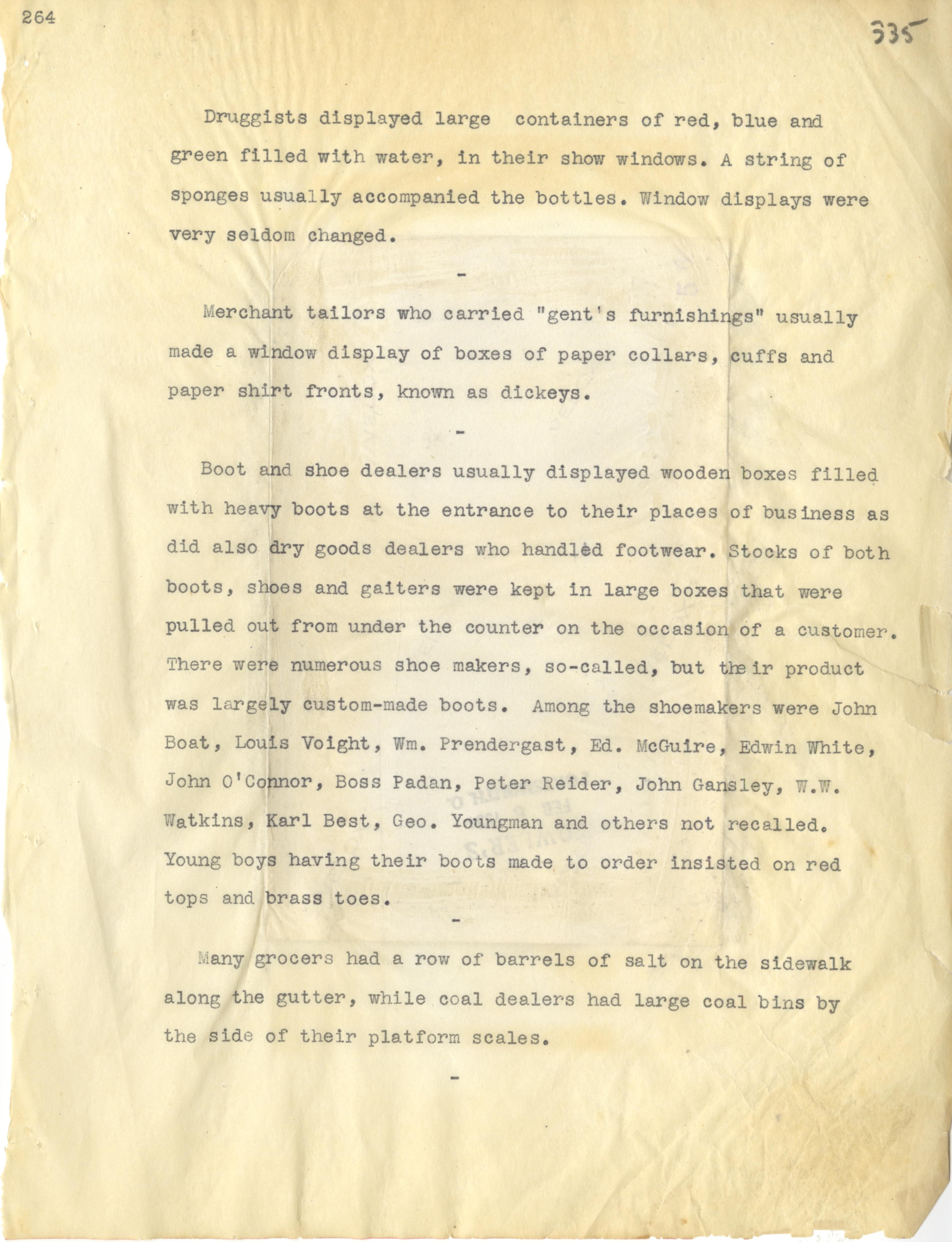 - Druggists; Merchant Tailors; Boot and Shoe Dealers; John Boat; Louis Voight; William Prendergast; Edward McGuire; Edwin White; John O'Connor; Boss Padan; Peter Reider; John Gansley; W.W. Watkins; Karl Best; George Youngman