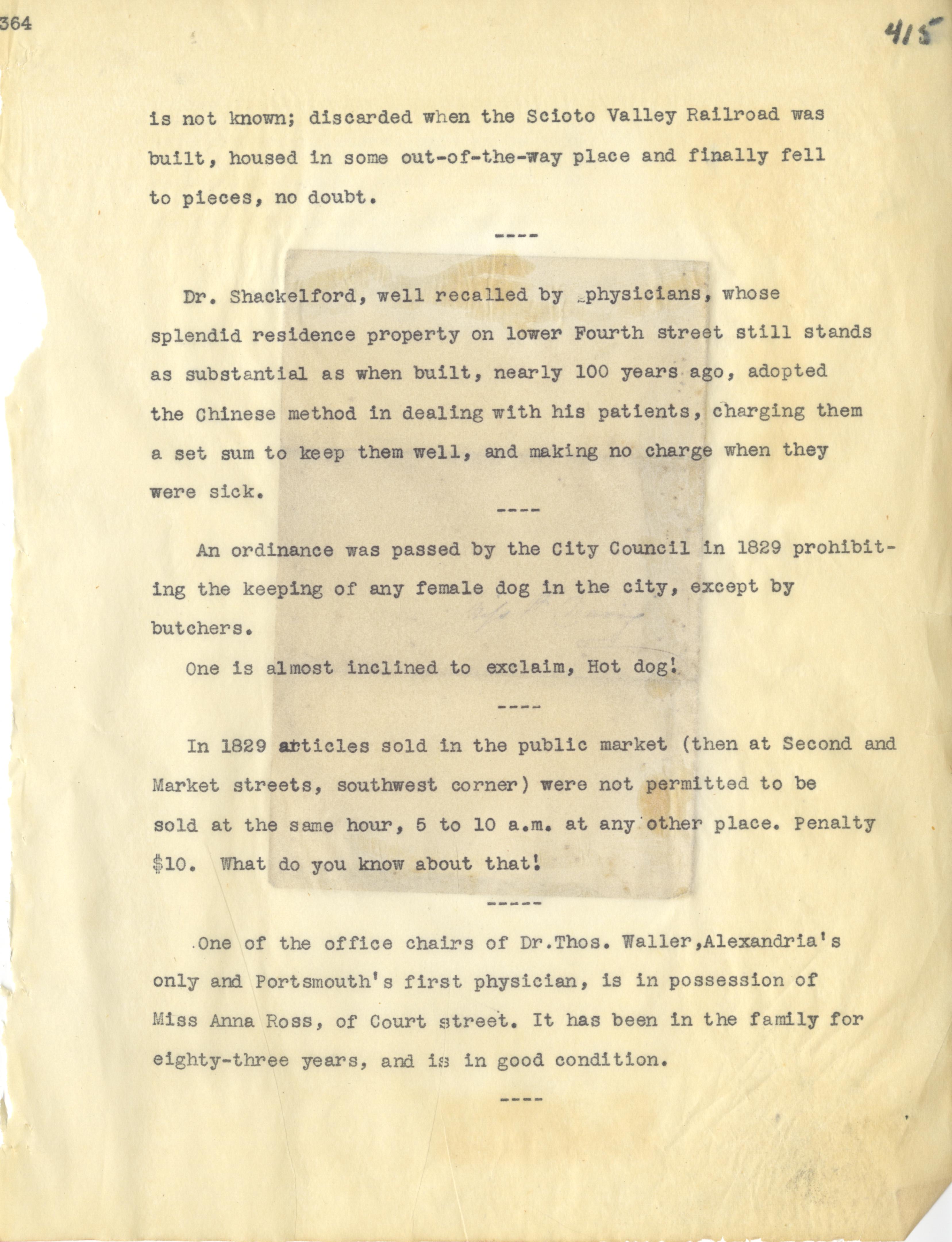 - Photo image of scanned scrapbook page 415. Scioto Valley Railroad; Dr. Shackelford; City Council; Ordinance (1829); Public Market (1829); Dr. Thomas Waller; Alexandria; Anna Ross