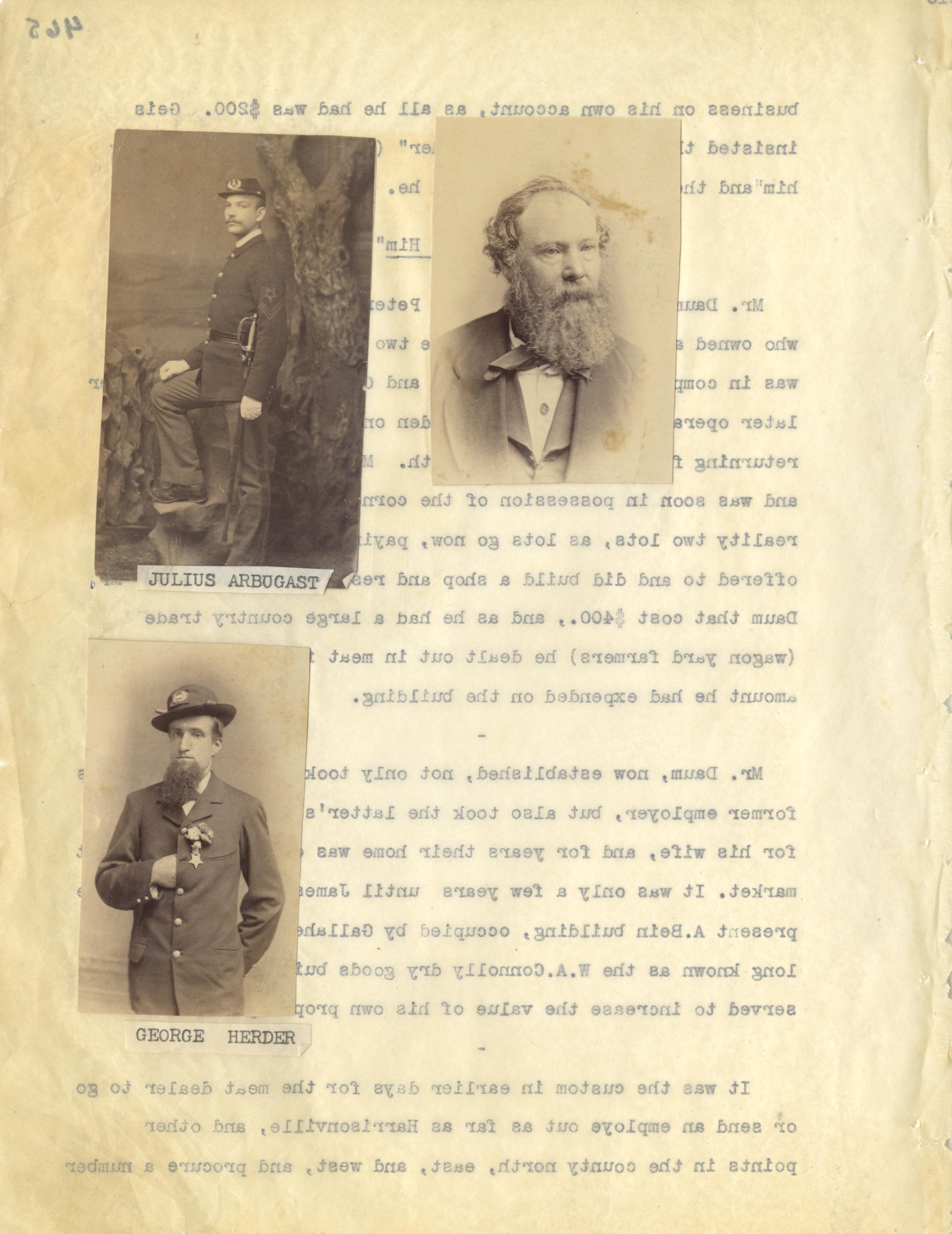 - Photo image of scanned scrapbook page. Julius Arbogast; George Herder; Unidentified Man