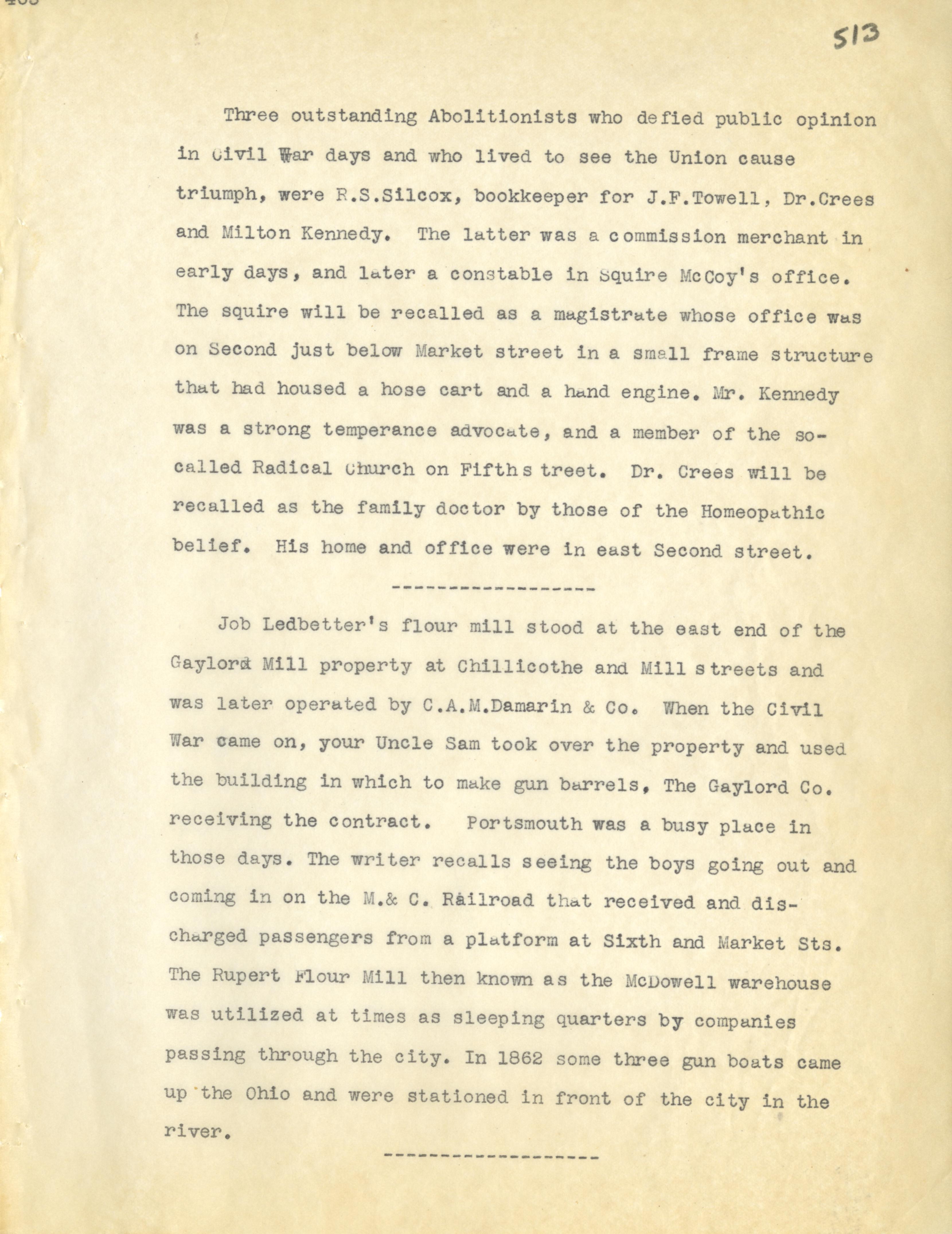 - Photo image of scanned scrapbook page. Pictured: typed page with information about Portsmouth during the Civil War. Abolitionists; business; Union; R. S. Silcox; J. F. Towell; Dr. Crees; Milton Kennedy; Squire McCoy; Mr. Kennedy; Homeopathic doctor; Job Ledbetter's flour mill on Chillicothe; Gaylord Mill; C. A. M. Damarin; gun barrels; Gaylord Company; M & C railroad; McDowell warehouses; Rupert Flour Mill; 1862: three gunboats were stationed in front of Portsmouth on the Ohio River