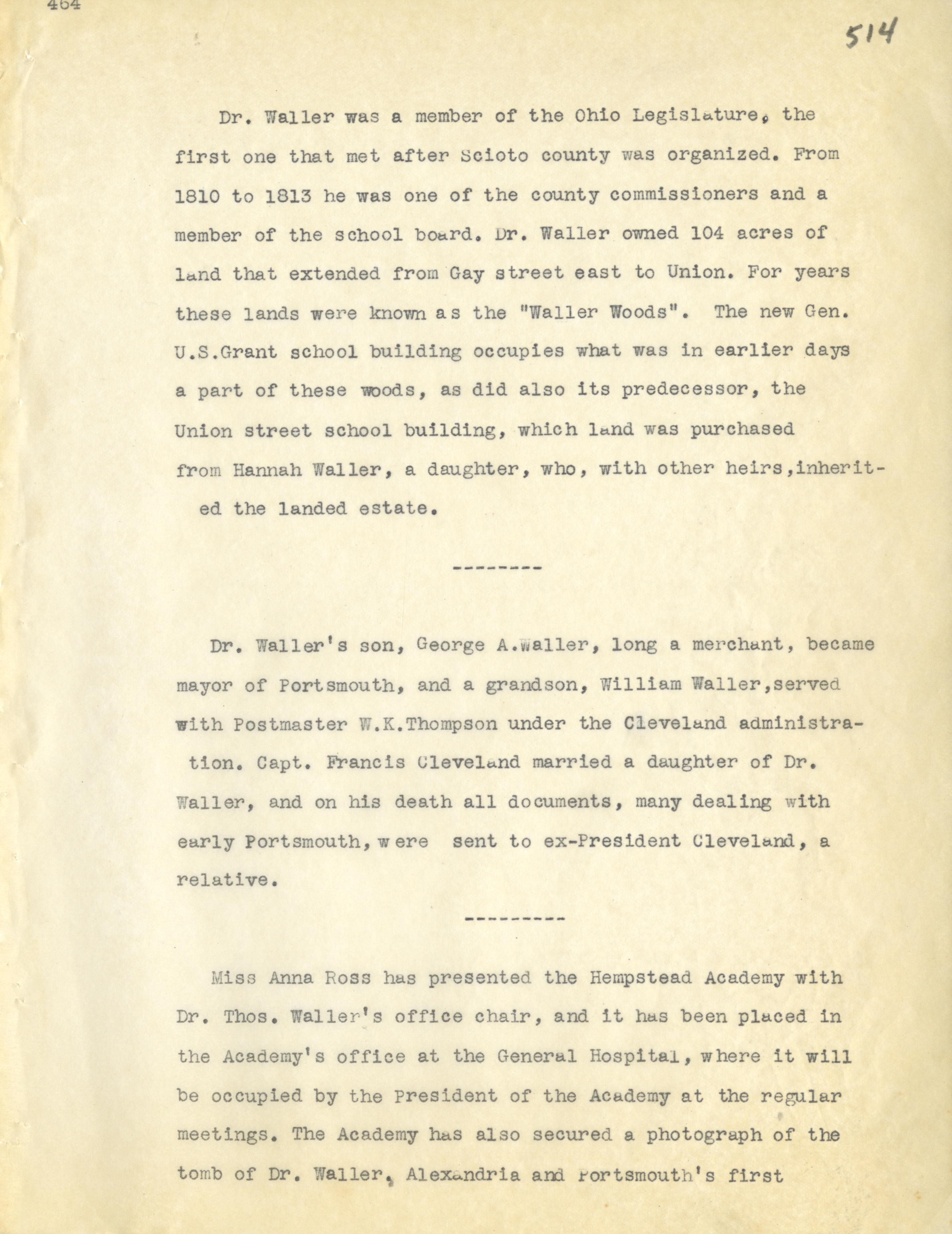 - Photo image of scanned scrapbook page 514. Dr. Waller; Ohio Legislature; County Commissioner (1810-1813); School Board; Waller Woods; Gen. U.S. Grant School; Union Street School; Hannah Waller; George A. Waller; Mayor; William Waller; Postmaster; W.K. Thompson; Capt. Francis Cleveland; Miss Anna Ross; Hempstead Academy; Dr. Thos. Waller; General Hospital; Alexandria