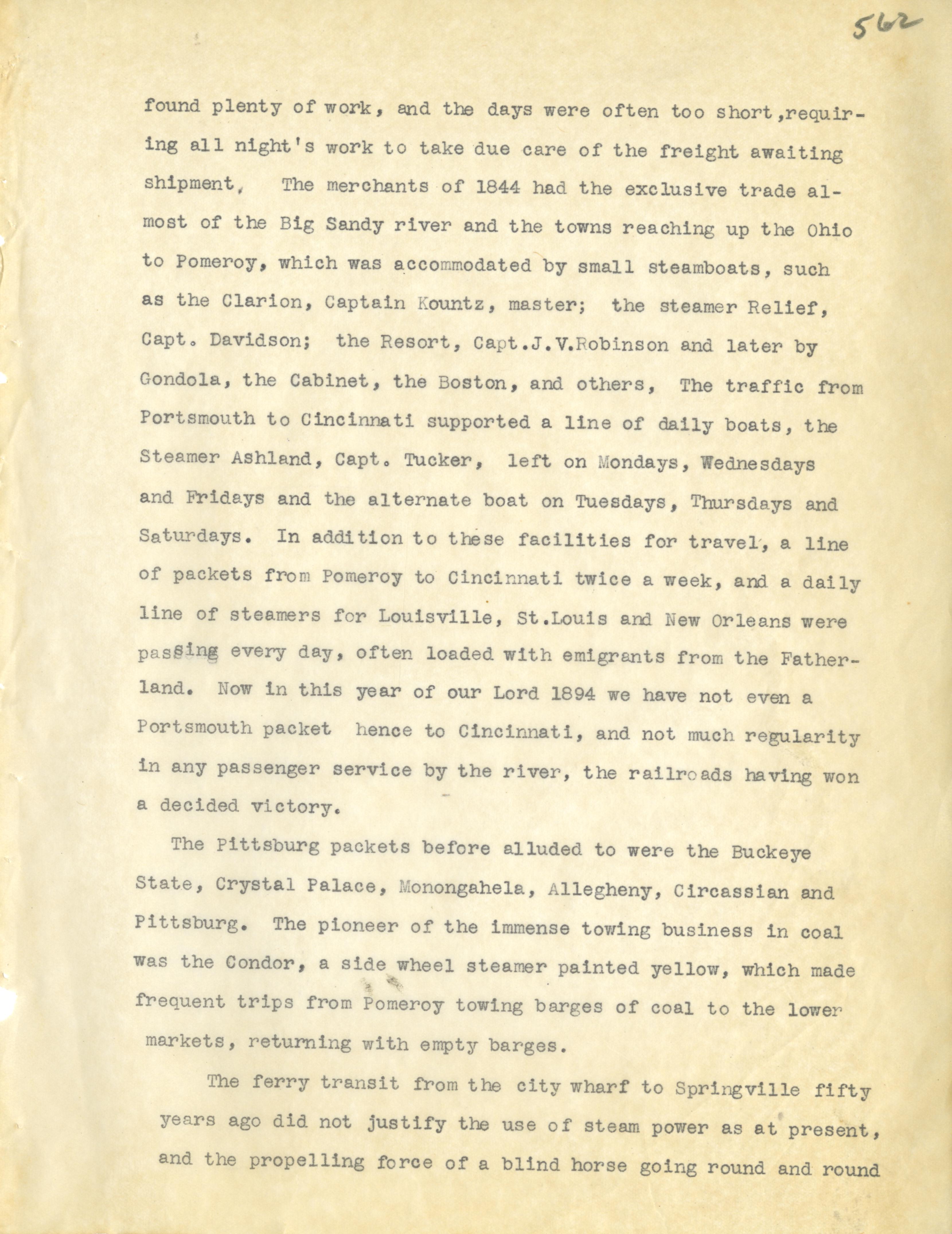- Photo image of scanned scrapbook page. Pictured: typed page with information about local Portsmouth businesses in 1844. merchants; Big Sandy River; steamboats: Clarion with Captain Kountz, Relief with Captain Davidson, the Resort with Captain J. V. Robinson; Gondola, the Cabinet, and the Boston, steamer Ashland with Captain Tucker; Portsmouth packet to Cincinnati; ferry