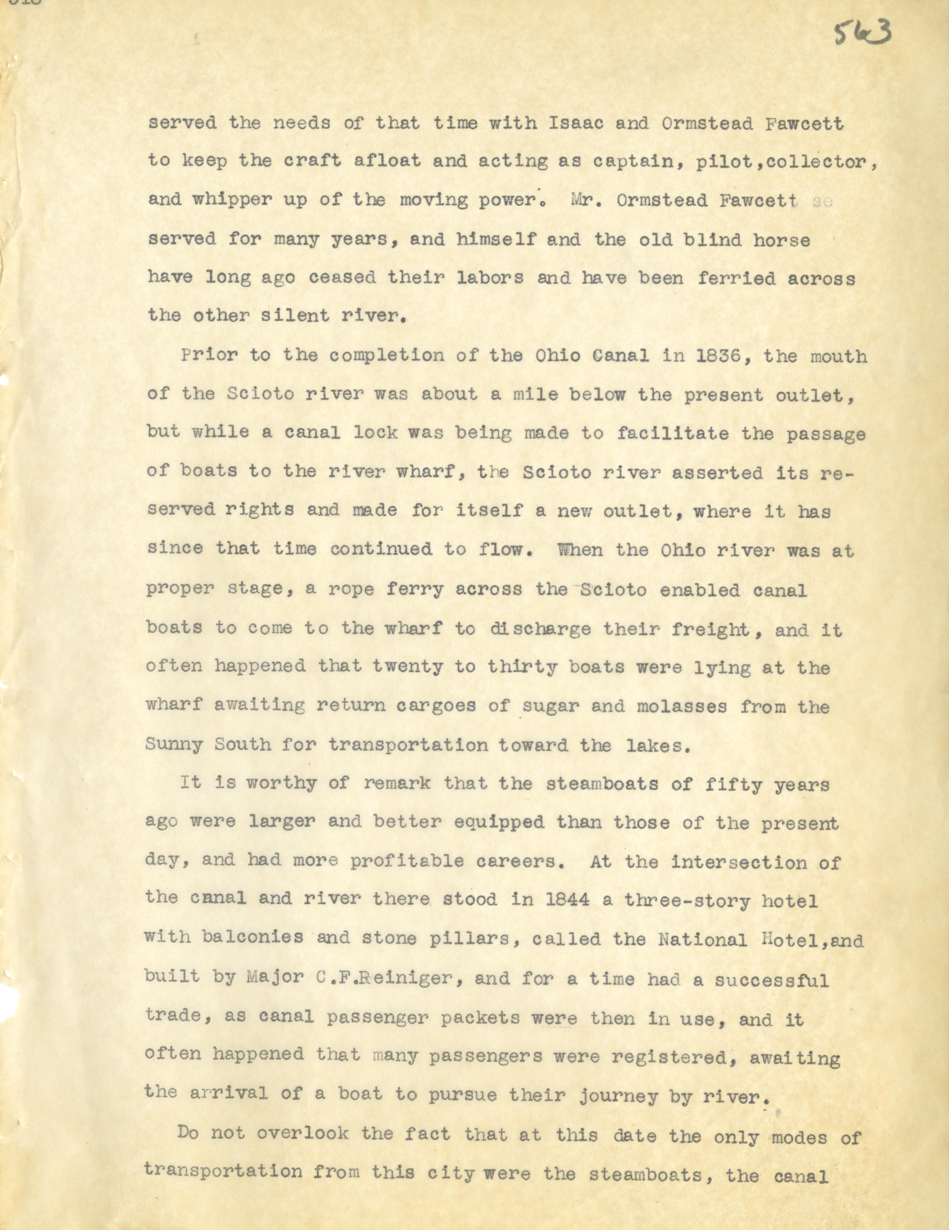- Photo image of scanned scrapbook page. Pictured: typed page with information about local Portsmouth businesses in 1844. Isaac and Ormstead Fawcett Ohio Canal; Scioto River; Ohio River; steamboats; National Hotel built by Major C. F. Reiniger