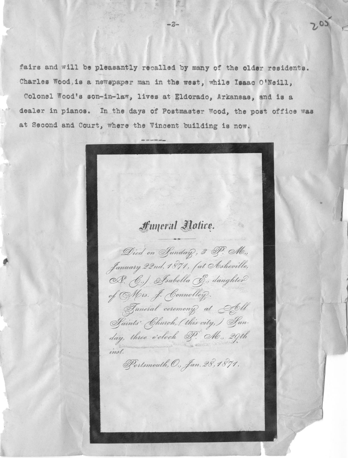 Below: a funeral notice for Isabella E. Connolley, 1871 - Creator