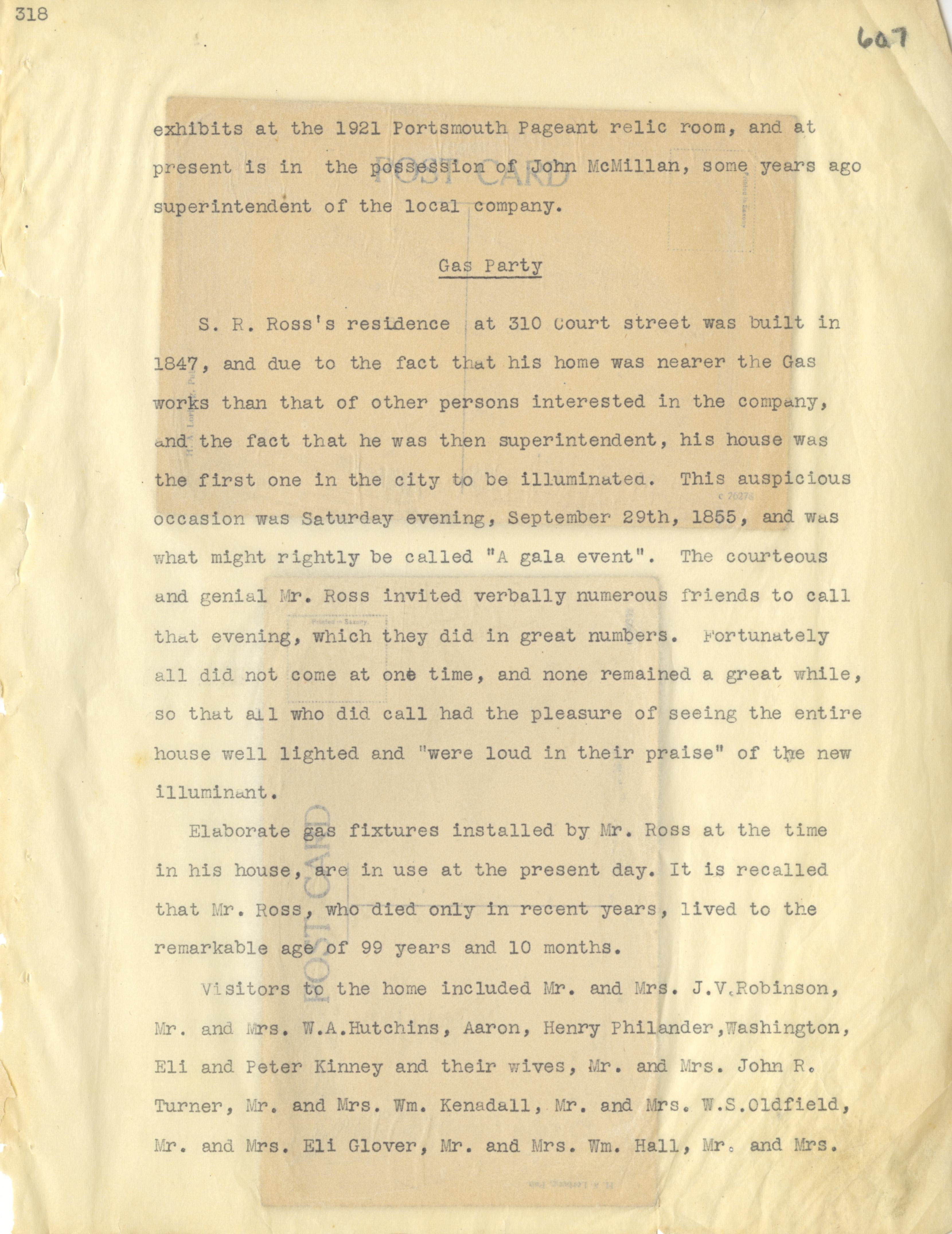 - Photo image of scanned scrapbook page. Pictured: typed page with information about the Gas Party. This was considered a Gala Event held at S. R. Ross's residence because it was close to the Gas Works and the first house to be illuminated in the city. Also listed are guests that attended the event. Mr. and Mrs. J. V. Robinson; Mr. and Mrs. W. A. hutchins; Aaron; Henry Philander; Washington; Eli and Peter Kinney and their wives; Mr. and MRs. John R. Turner; Mr. and Mrs. Wm. Kendall; Mr. and Mrs. W. S. Oldfield; Mr. and Mrs. Eli Glover; Mr. and Mrs. Wm. Hall; Portsmouth Pageant Relic Room of John McMillan