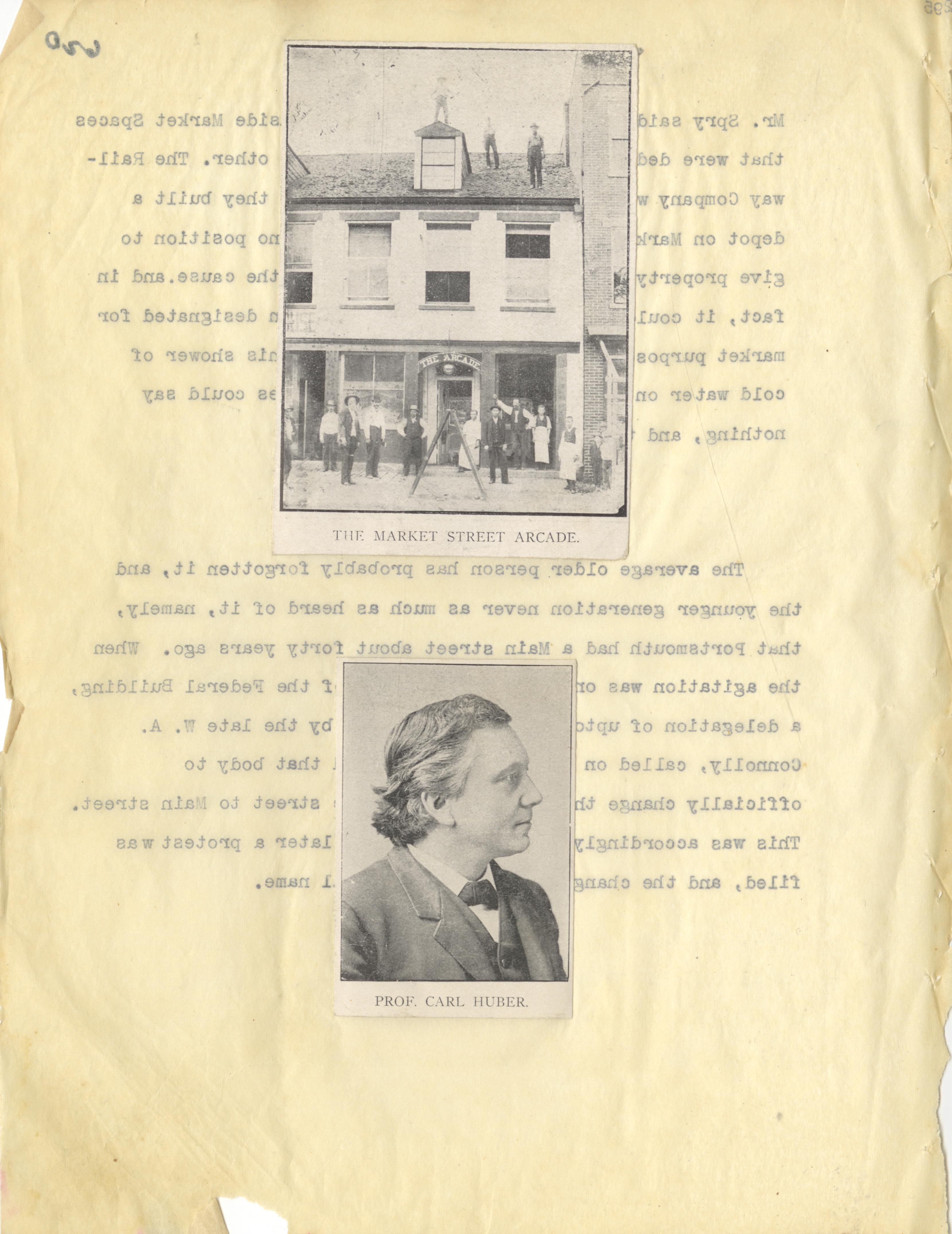 - Photo image of scanned scrapbook page. Pictured: The Market Street Arcade; Professor Carl Huber. Images cut from Lorberg's Portsmouth Pictorial, and Lorberg glued them into scrapbook.