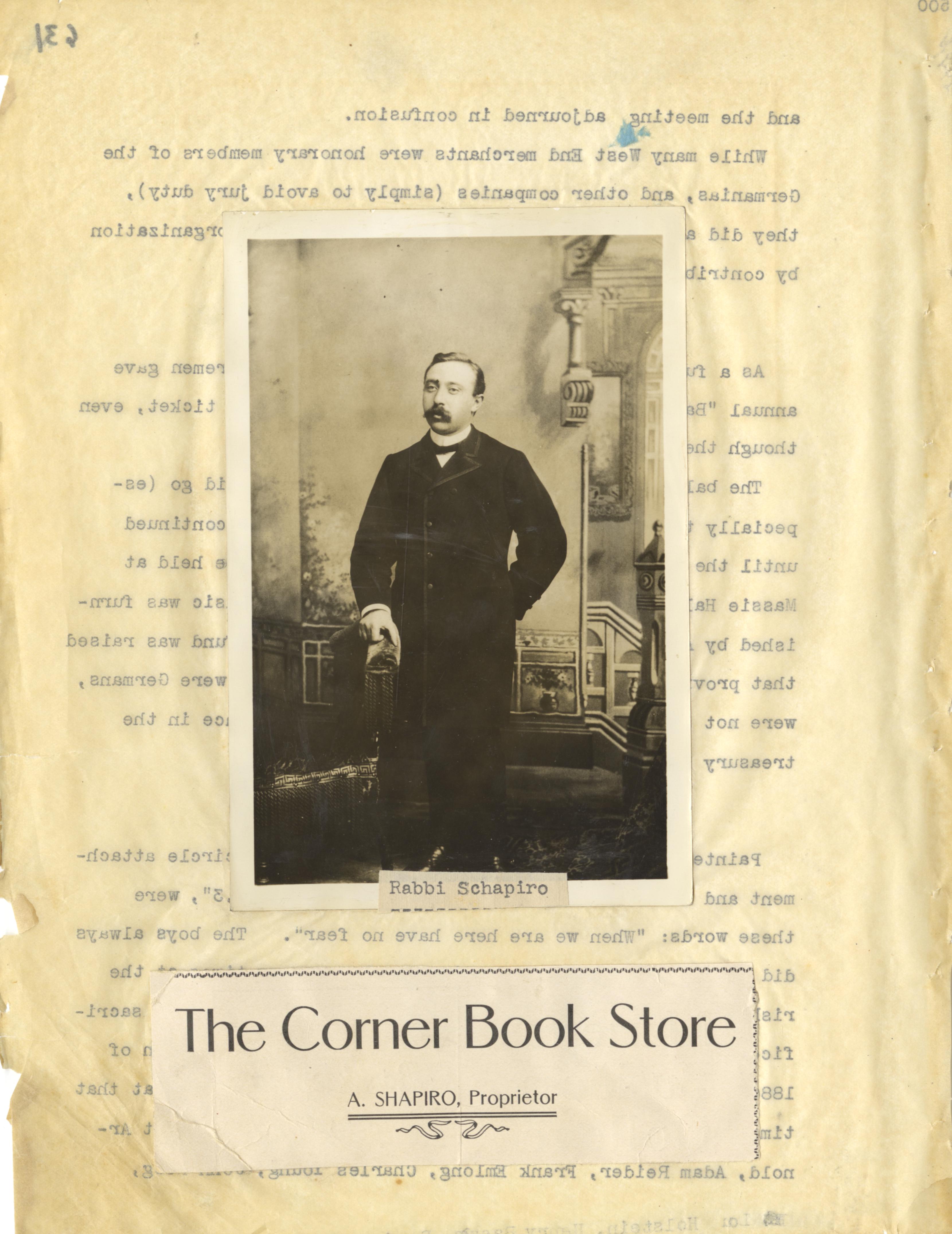 - Photo image of scanned scrapbook page. Pictured: Rabbi Schapiro; Ad for the Corner Book Store, A. Shapiro, proprietor