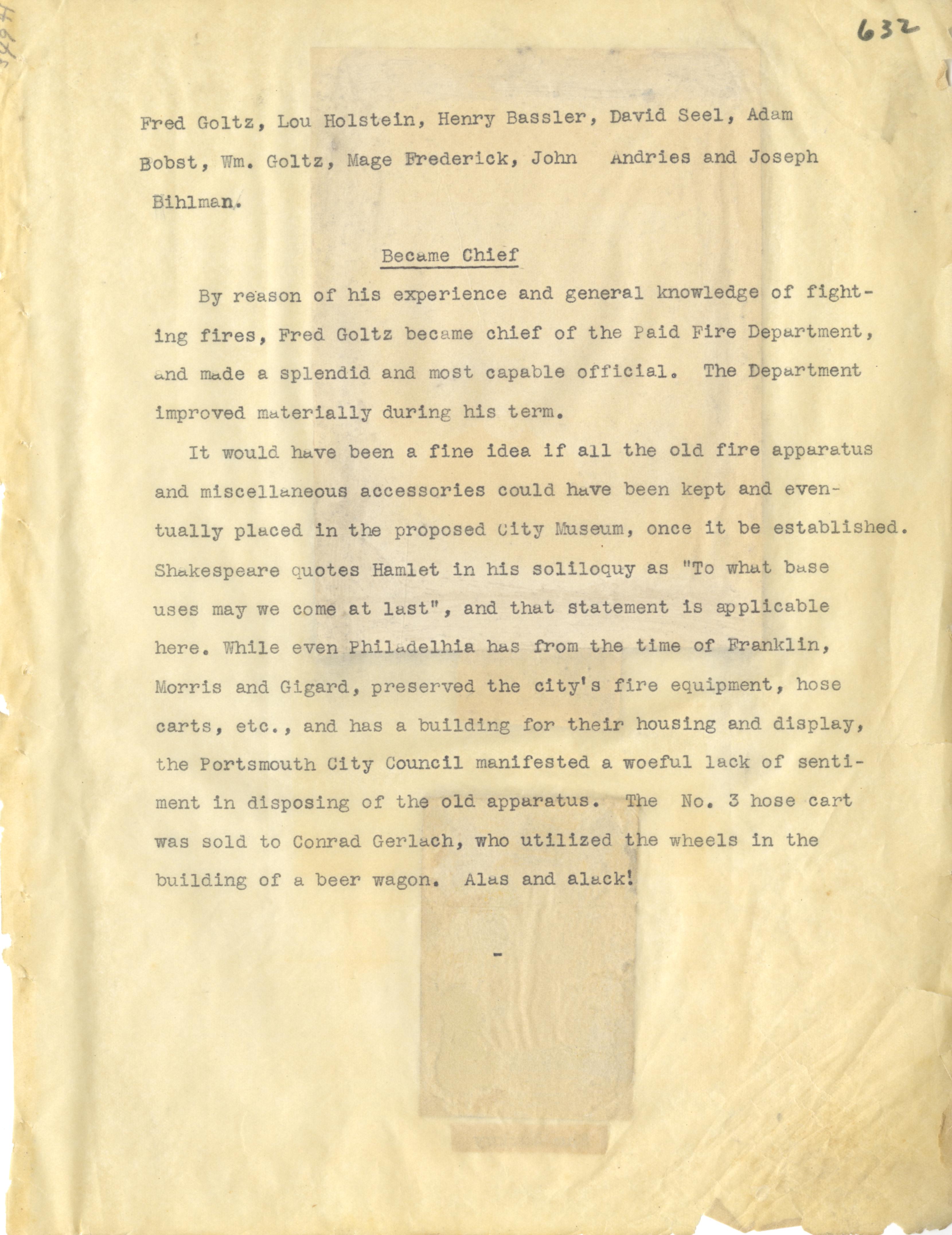 - Photo image of scanned scrapbook page. Pictured: typed page giving information about Fred Goltz becoming Chief of the Paid Fire Department; Lou Holstein; Henry Bassler; David Seel; Adam Bobst; William Goltz; Mage Frederick; John Andries; Joseph Bihlman; Fred Goltz
