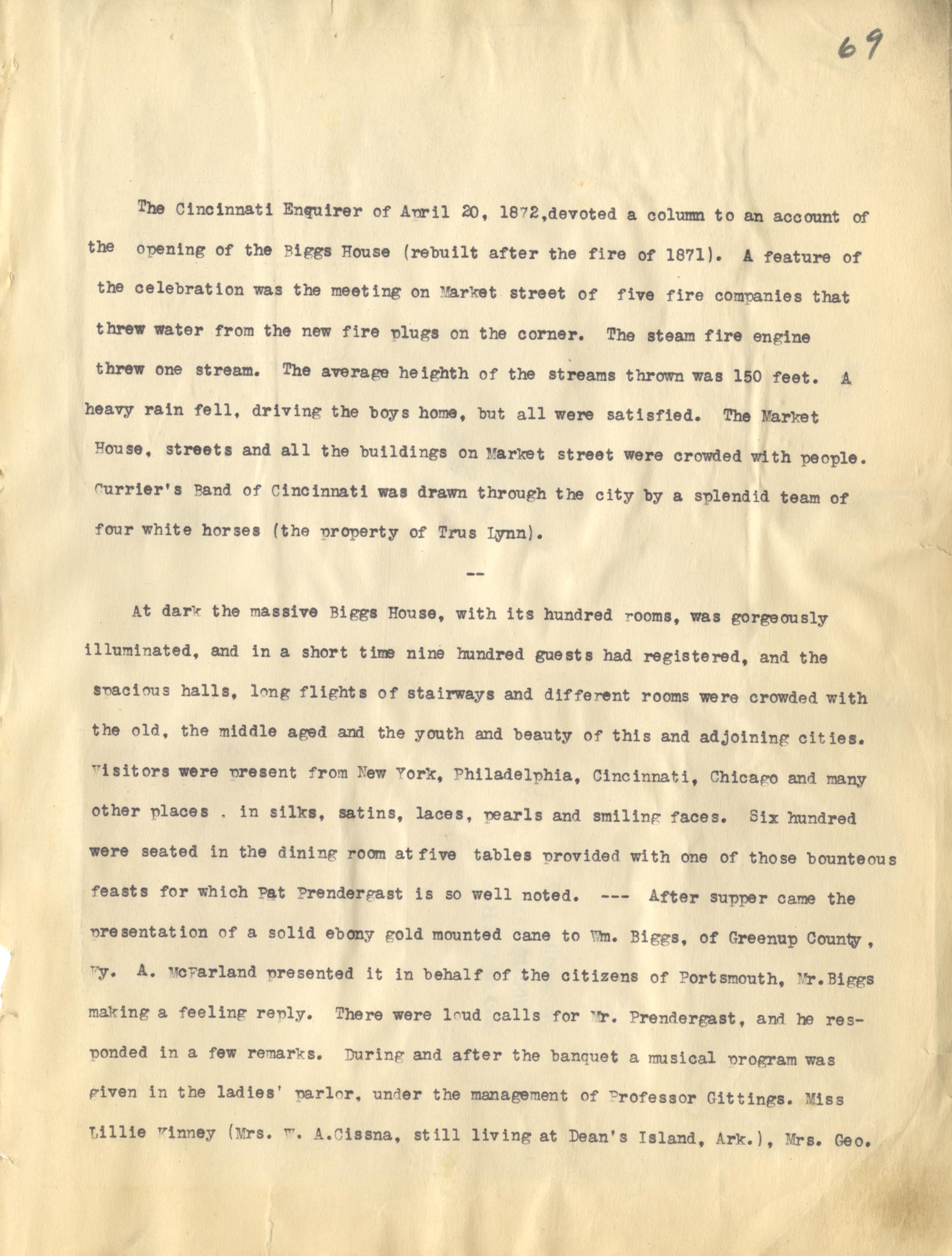 - Photo image of scanned scrapbook page 69. The Cincinnati Enquirer (1872); Biggs House (1871); Market Street; Market House; Currier's Band of Cincinnati; White Horses; Trus Lynn; William Biggs; A. McFarland; Mr. Prendergast; Professor Gittings; Miss Lillie Kinney; Mrs .W.A. Cissna