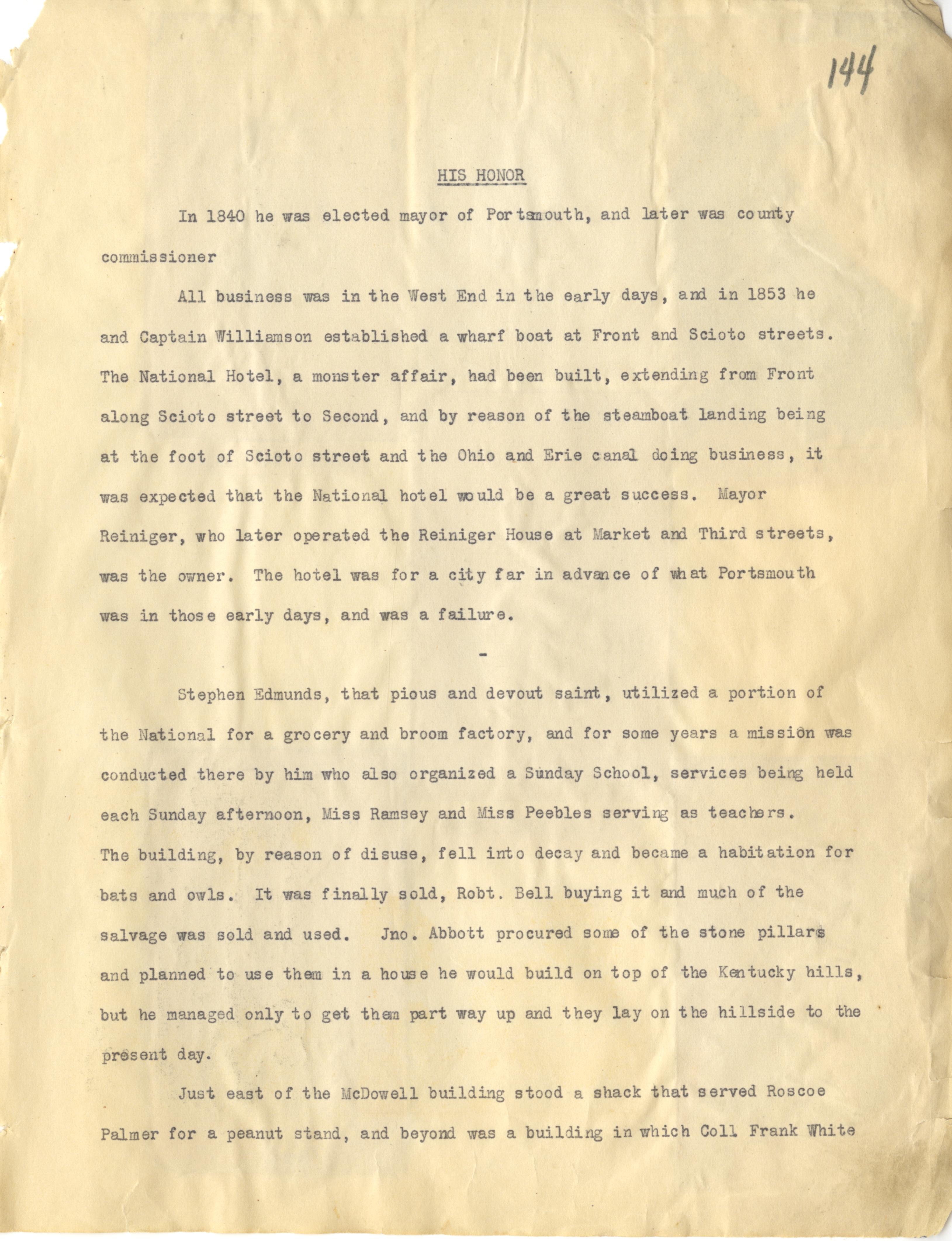- Photo image of scanned scrapbook page 144. His Honor; Mayor (1840); County Commissioner; West End; Captain Williamson (1853); Wharf Boat; Front Street; Scioto Street; National Hotel; Ohio- Erie Canal; Mayor Reiniger; Reiniger House; Market Street; Third (3rd) Street; Stephen Edmunds; Miss Ramsey; Miss Peebles; Robert Bell; John Abbott; Kentucky Hills; McDowell Building; Roscoe Palmer ;Peanut Stand; Coll. Frank White