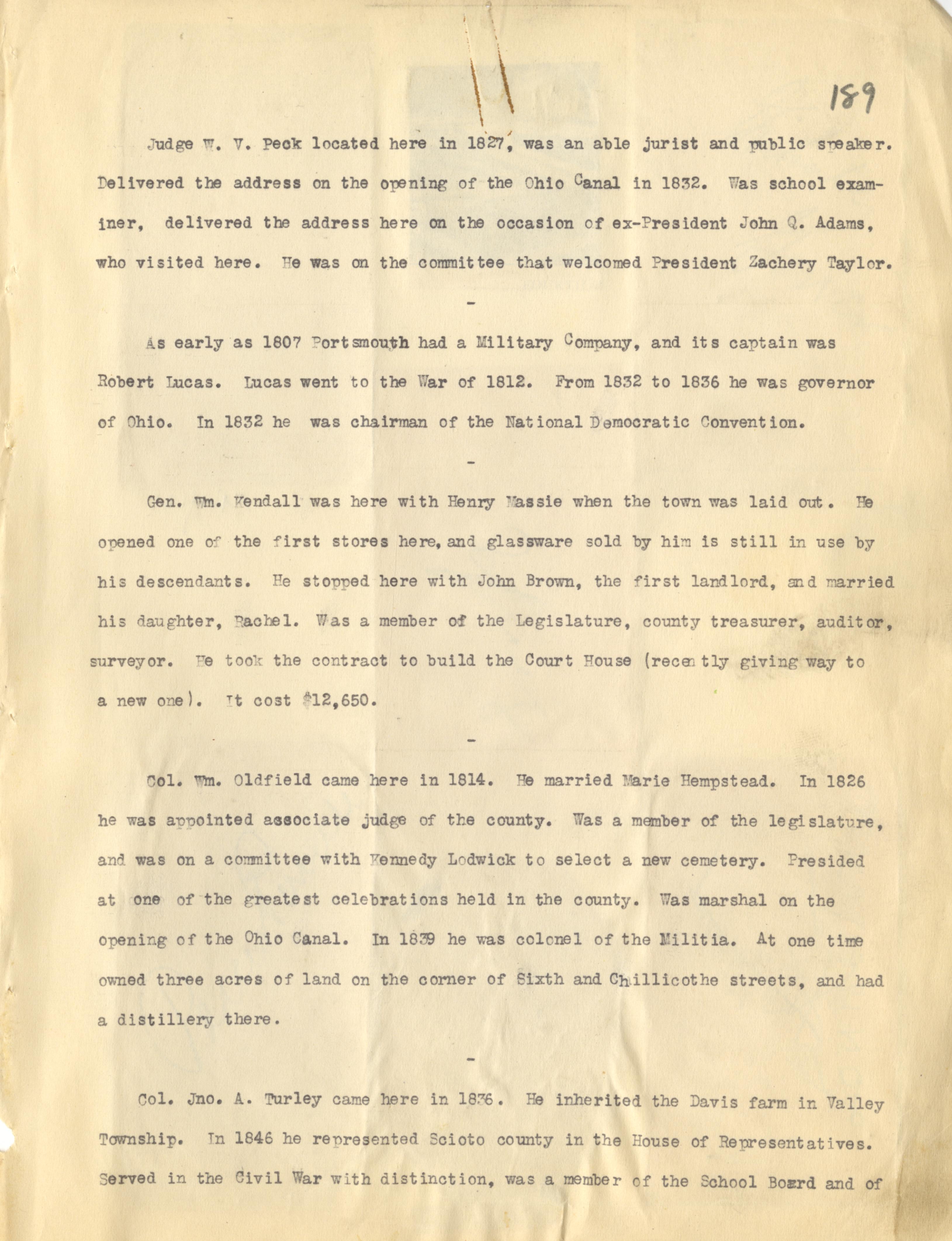 - Photo image of scanned scrapbook page 189. Judge W.V. Peck (1827); Ohio Canal (1832); John Q. Adams; Zachery Taylor; Military Company (1807); Robert Lucas; War of 1812; Governor (1832-1836); Chairman of the National Democratic Convention (1832); Gen. William Kendall; Henry Massie; John Brown; Rachel; Court House; Col. William Oldfield;(1814); Marie Hempstead; Kennedy Lodwick; Ohio Canal; Colonel of the Militia (1839); Sixth (6th) Street; Chillicothe Street; Distillery; Col. John A. Turley (1846); Davis Farm; Valley Township; House of Representatives (1846); Civil War; School Board