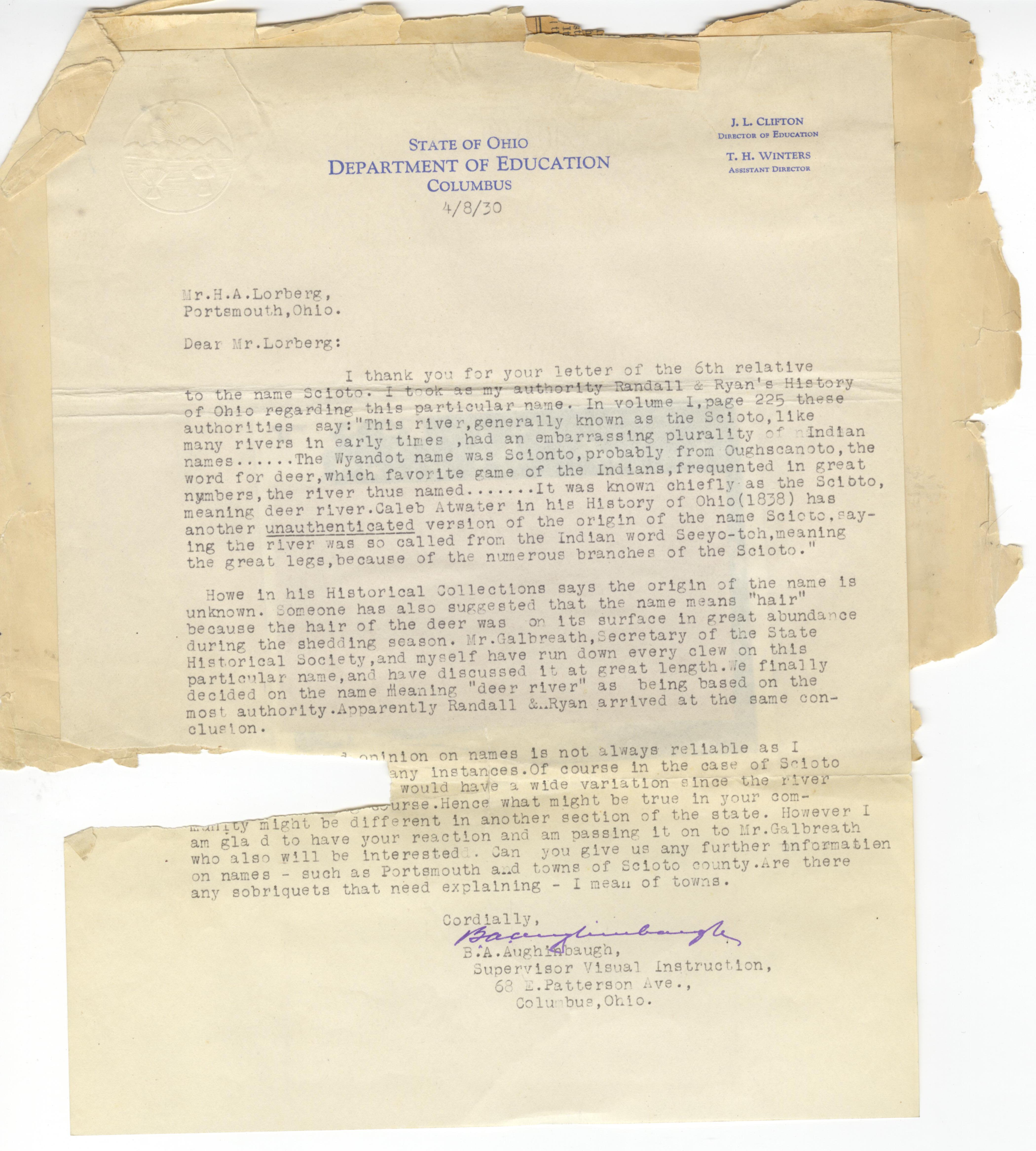 - Scanned scrapbook page showing a typed letter dated April 8, 1930 from Ohio Board of Education discussing the origin of the word "Scioto." Paper is damaged.