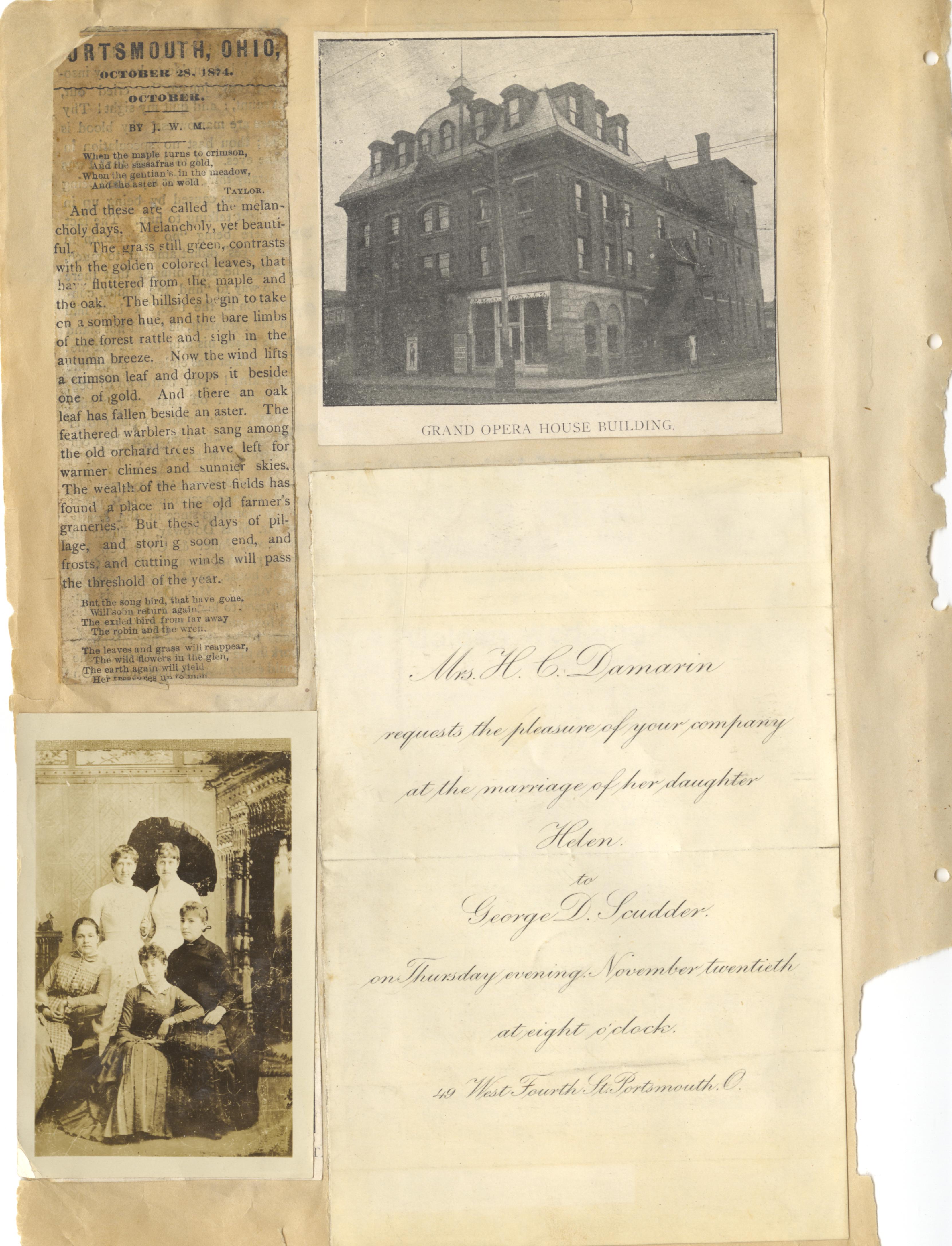 - Photo image of scanned scrapbook page. Grand Opera House; J. W. M. (1874); Mrs. H. C. Damarin; Helen; George D. Scudder.