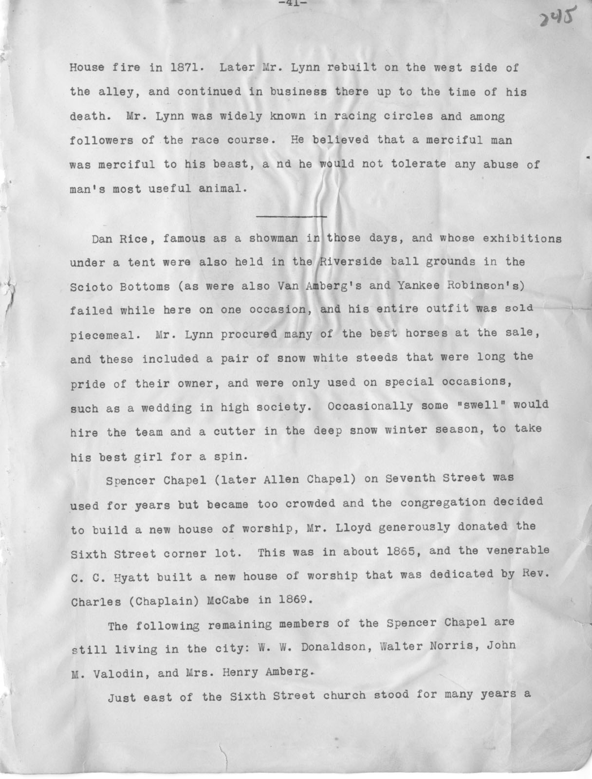 - Scanned page 245 from Henry A. Lorberg scrapbook containing typed text recalling the history of Play House property which was originally owned by John Brown. The first building to occupy the space was known as the Inn where travelers could stop for food. Other occupants of the property included Distel Furniture Company, General Kendall; Kendall boarding house; Smoke House