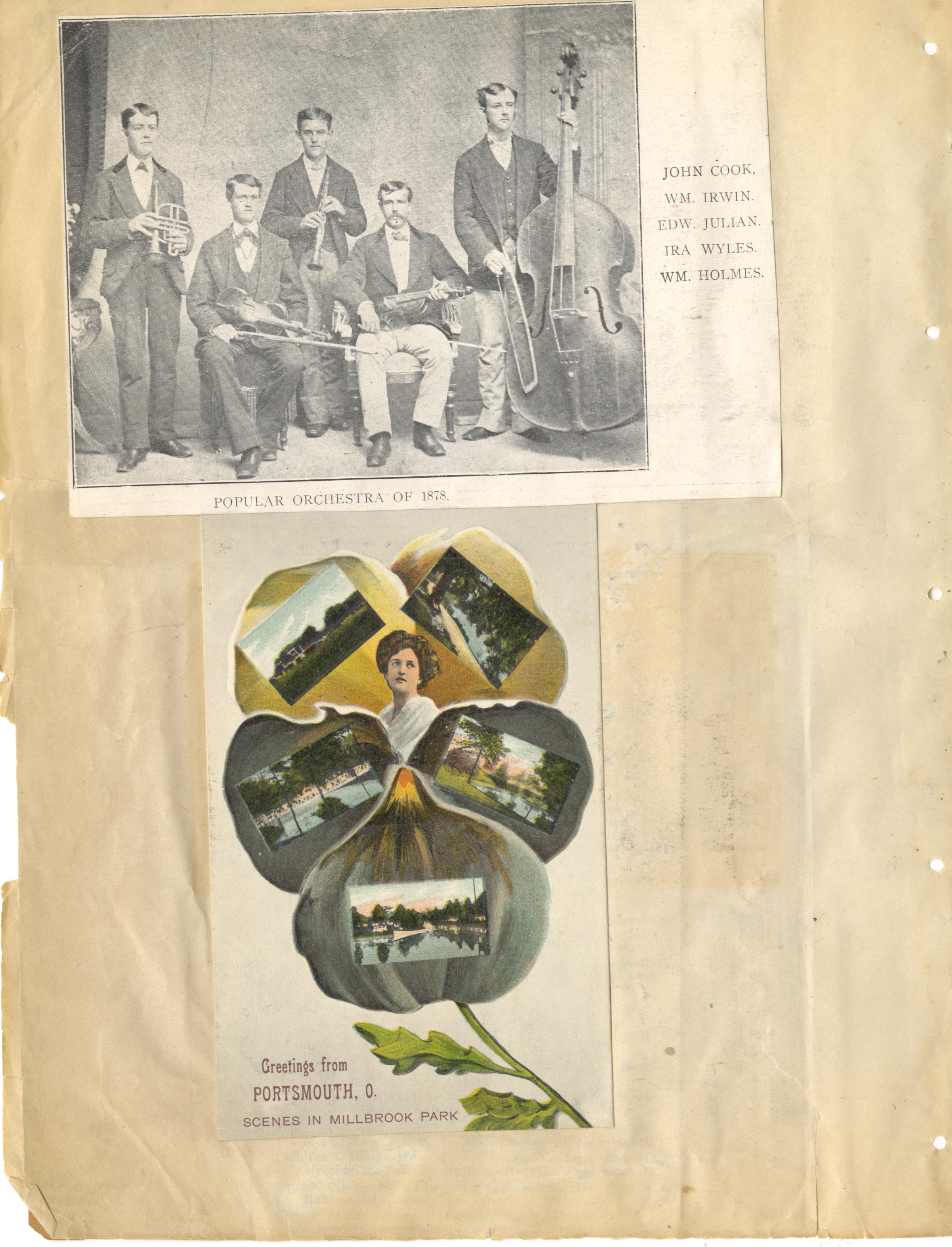 - Photo image of scanned scrapbook page. Popular Orchestra of 1878; John Cook; William Irwin; Edward Julian; Ira Wyles; William Holmes; Greeting from Portsmouth, O.; Millbrook Park