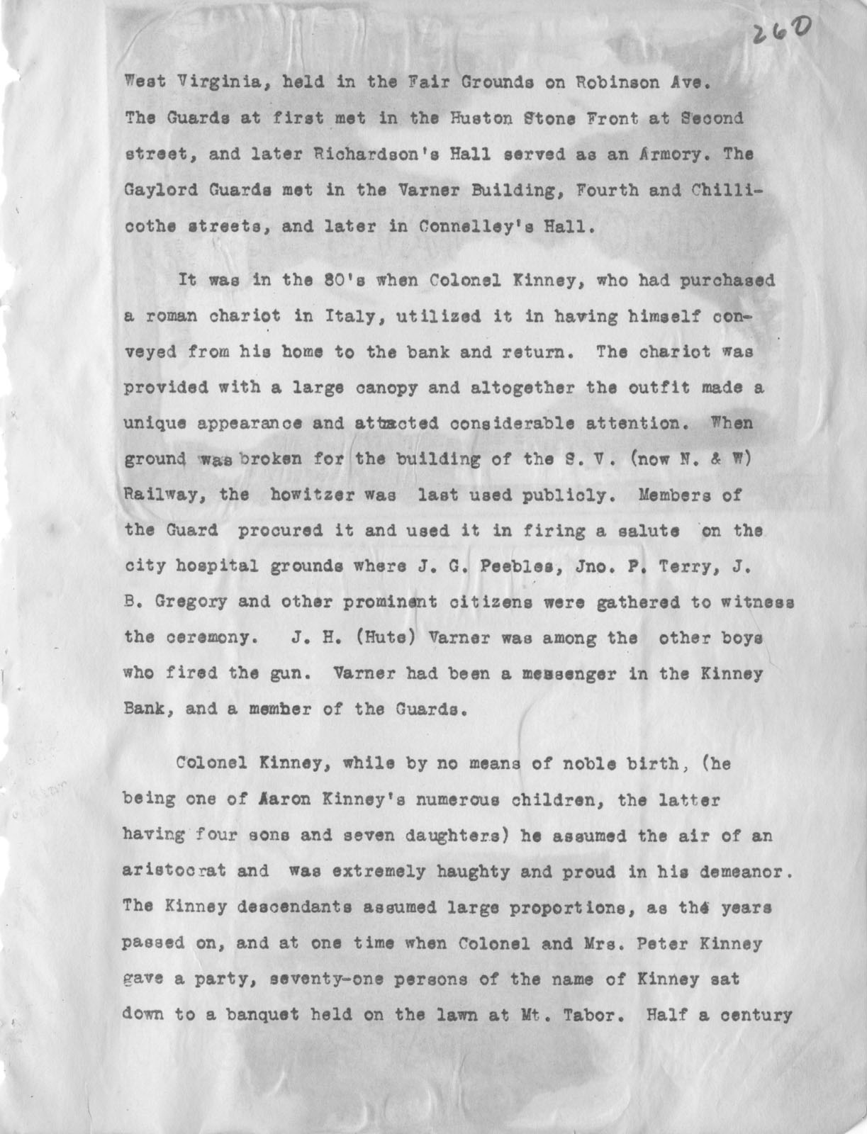 - Scanned page 260 from Henry A. Lorberg scrapbook containing typed text describing aspects of the Kinney Family and their life in Portsmouth.