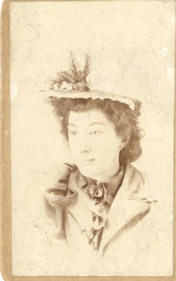 - Sepia tone small photo of a lady wearing a hat and a light colored coat.