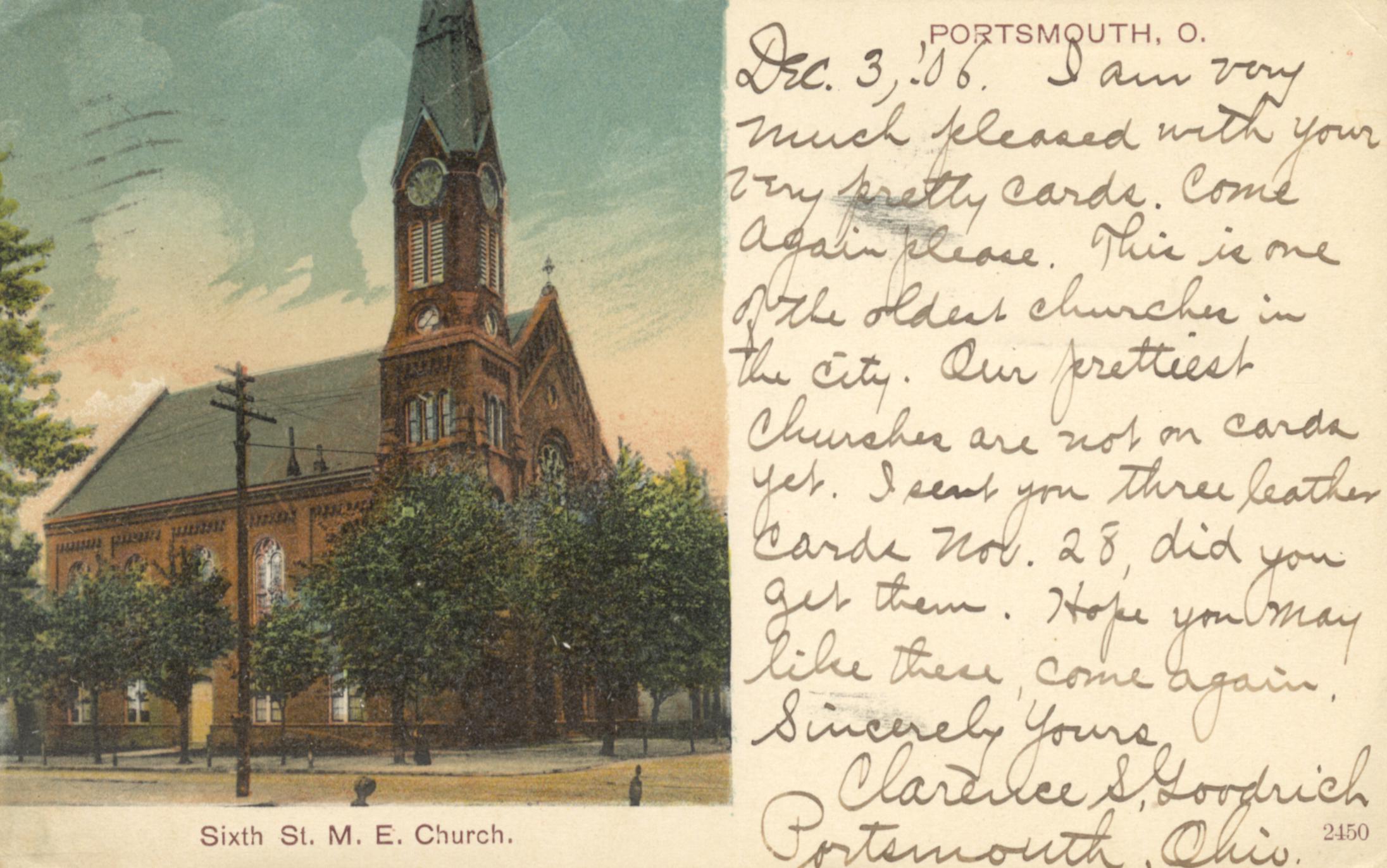 H. A .Lorberg, Publisher, “Sixth (6th) St. M.E. Church,” Scioto County Public Library Local History Digital Collection, accessed December 16, 2025, https://sciotolibrary.org/history/items/show/24869.