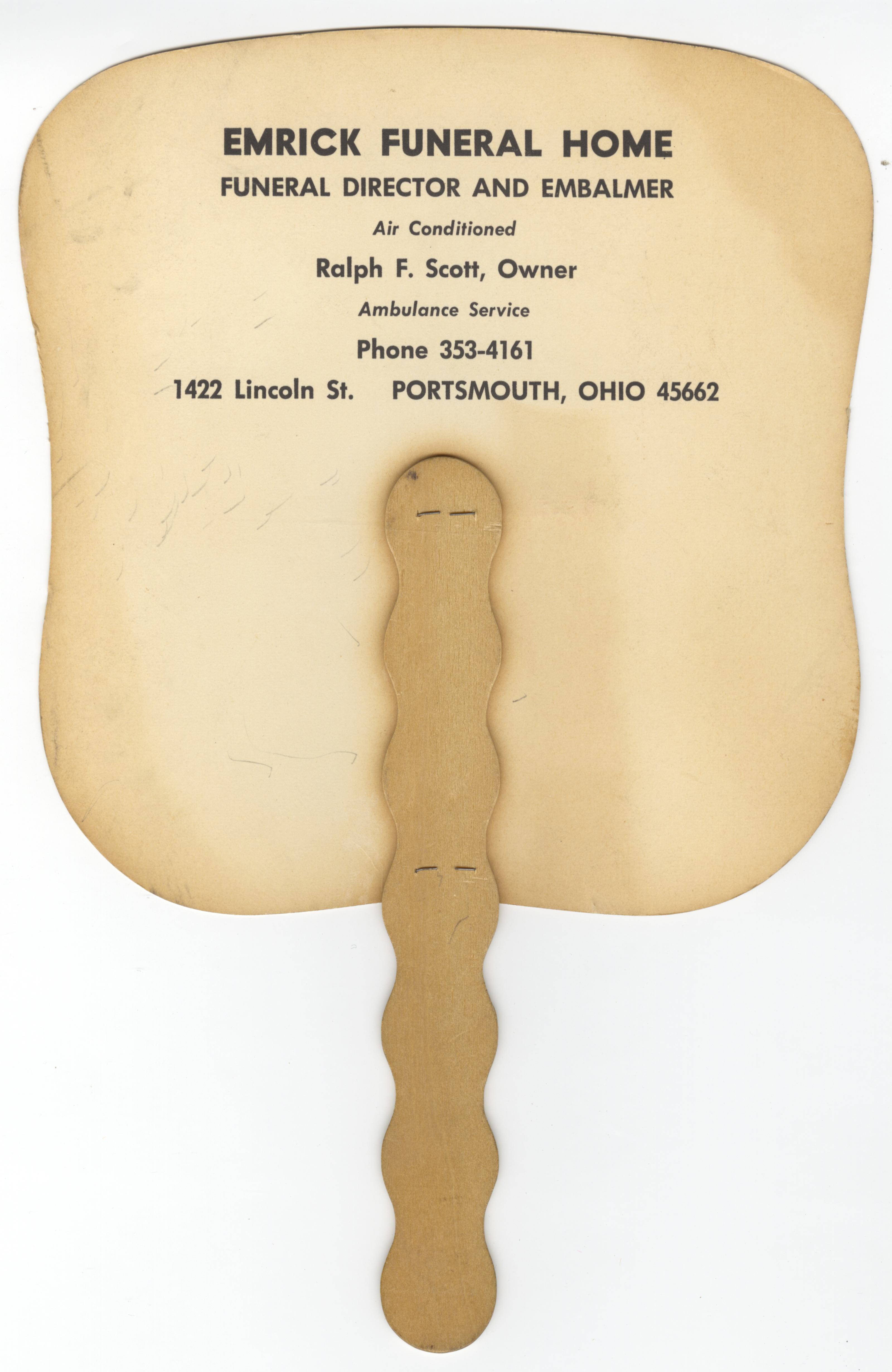 A. Scheer , “Emrick Funeral Home Fan,” Scioto County Public Library Local History Digital Collection, accessed December 15, 2025, https://sciotolibrary.org/history/items/show/25051.