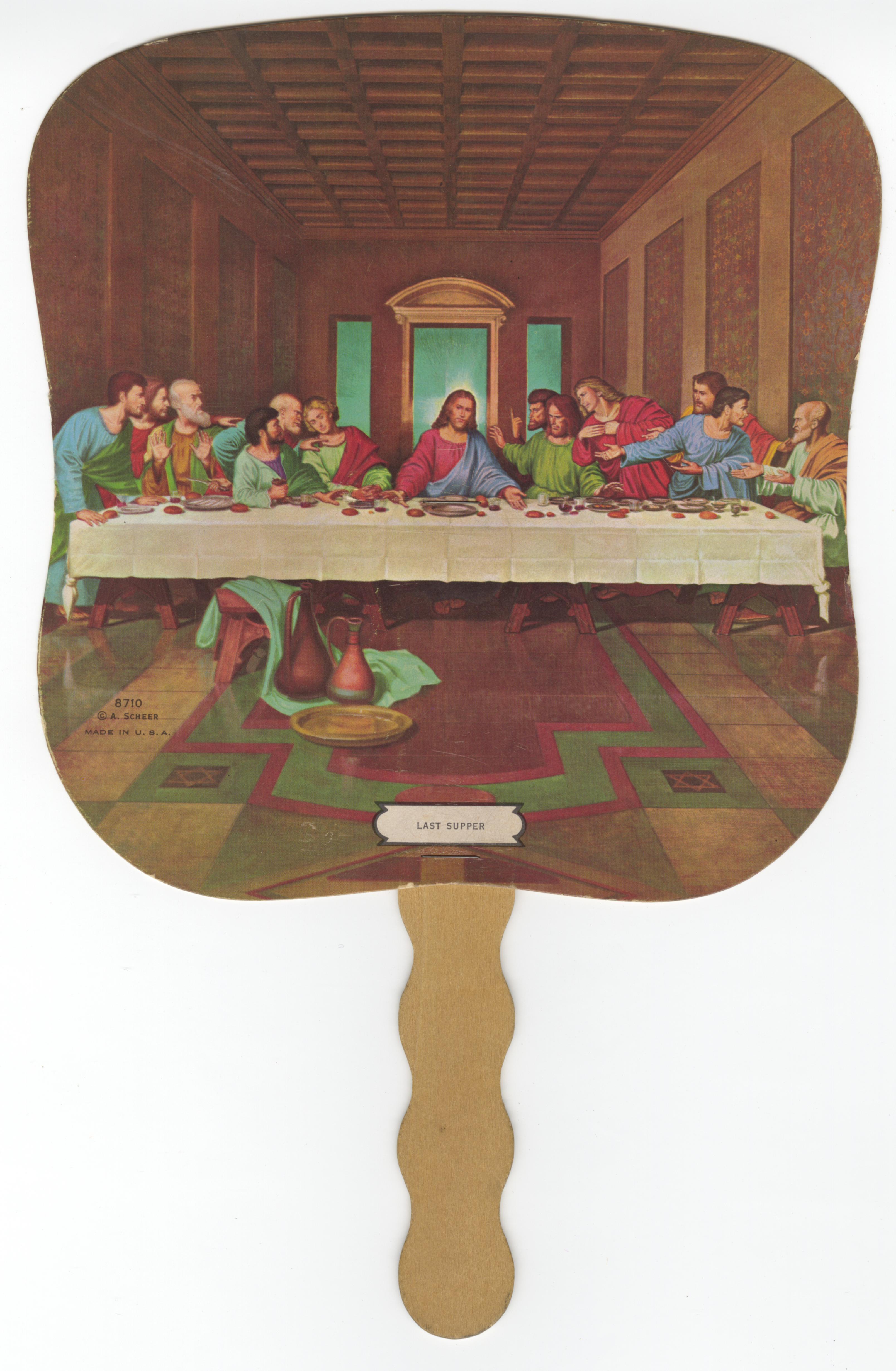 - Yellowed advertisement on one side: colored painting of "Last Supper" on back: "Emrick Funeral Home, Funeral Director and Embalmer, Air Conditioned, Ralph F. Scott, owner, Ambulance Service, Phone 353-4161, 1422 Lincoln St., Portsmouth, Ohio, 45662. 1963: Ralph Scott became part owner of Emrick-Scott
