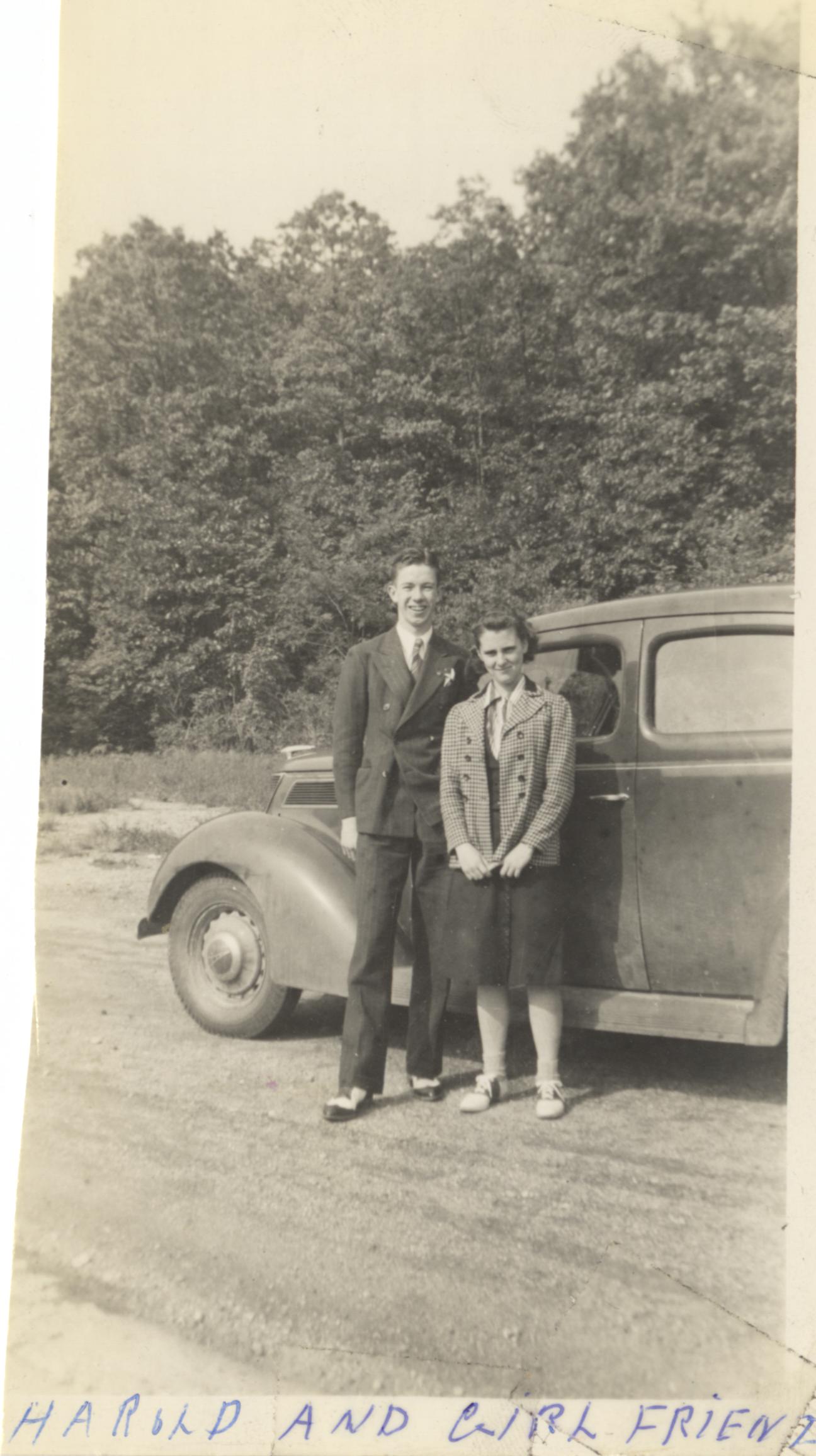 - Black and white photo image of Harold Allman, son of Roy and Lottie Allman, and his girlfriend. They are standing in front of a car.