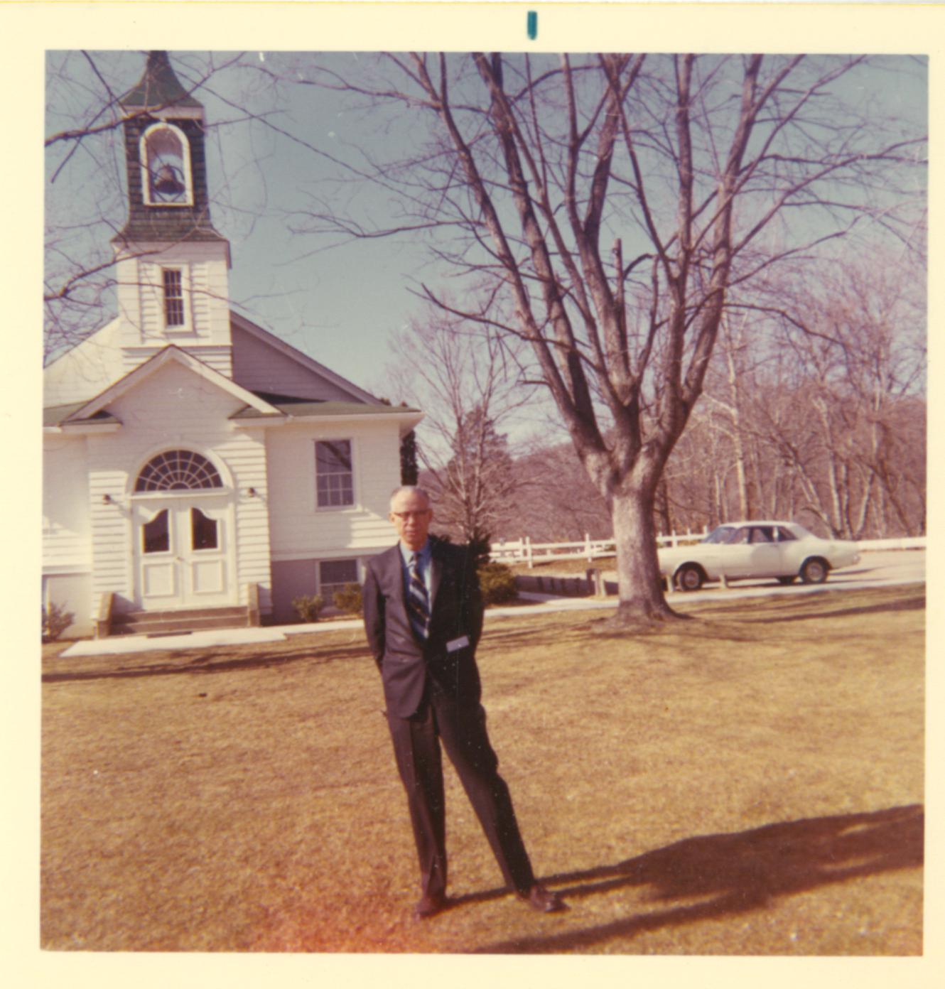 - Colorized photo image of Roy Allman in front of Friendship United Methodist Church.