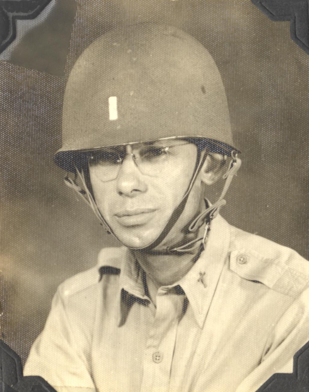 - Black and white photo image of Roy Allman as a chaplain in the army in the 1940's.