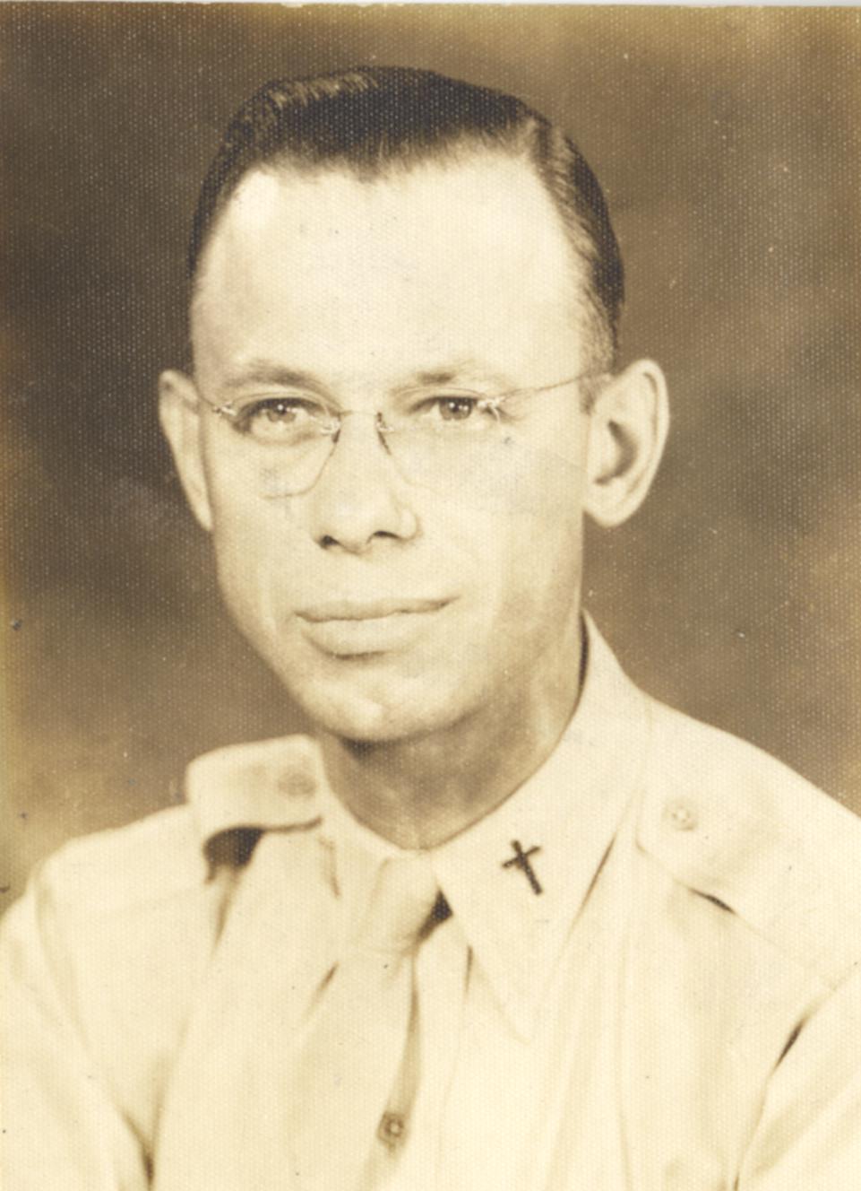 - Black and white photo image of Roy Allman when he was a chaplain in the army in the 1940's.