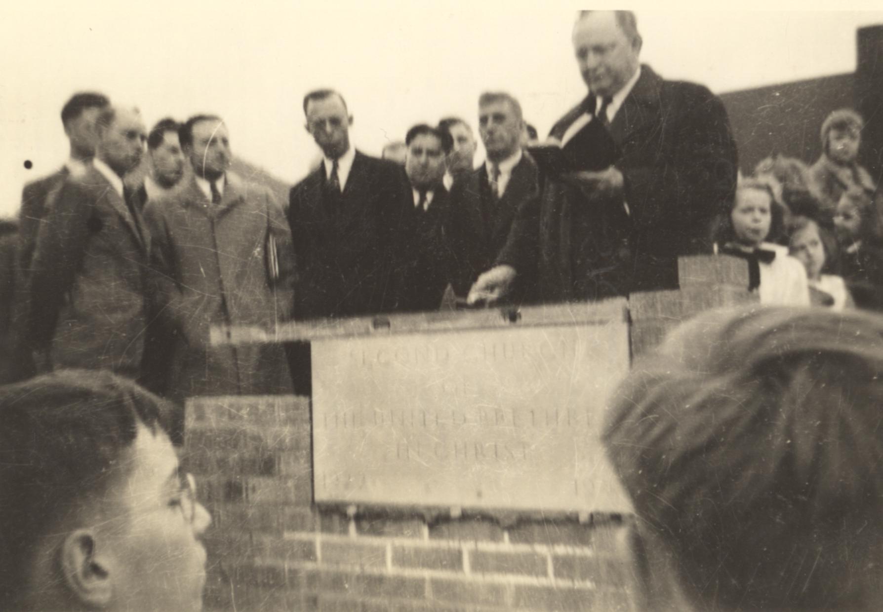 - Black and white photo image of a prayer going on at the First United Brethren Church at Seventh (7th) and Gay Streets: Roy Allman (sunglasses. (May 29, 1942)