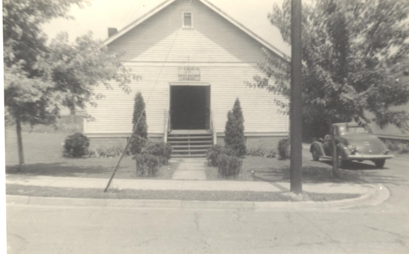 - Black and white photo image of the North Moreland United Brethren Church in 1941.